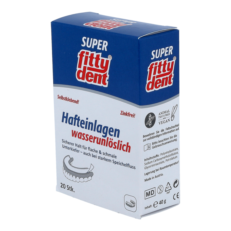 Fittydent Super Hafteinlage Comfort ist die perfekte Lösung für Patienten mit flachem oder schmalem Unterkiefer. Die Hafteinlagen garantieren einen sicheren und festen Halt der Unterkieferprothese auch in den schwierigsten Fällen der Zahnprothetik. Die Fittydent Hafteinlagen sind wasserunlöslich und eignen sich daher auch bei starkem Speichelfluss..