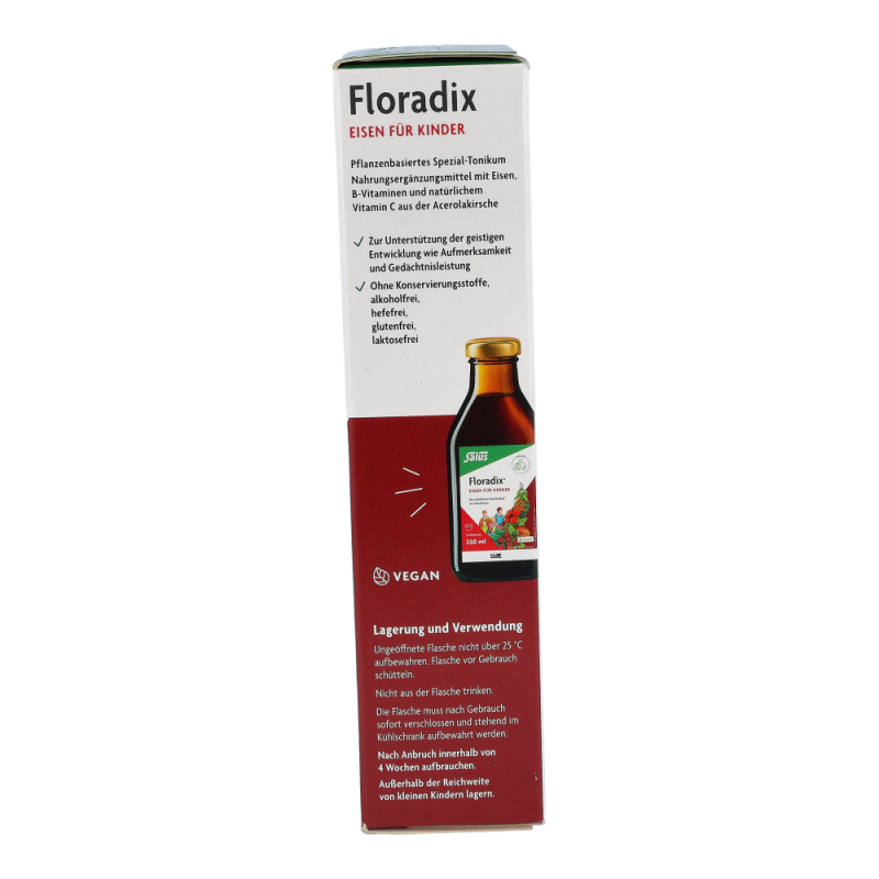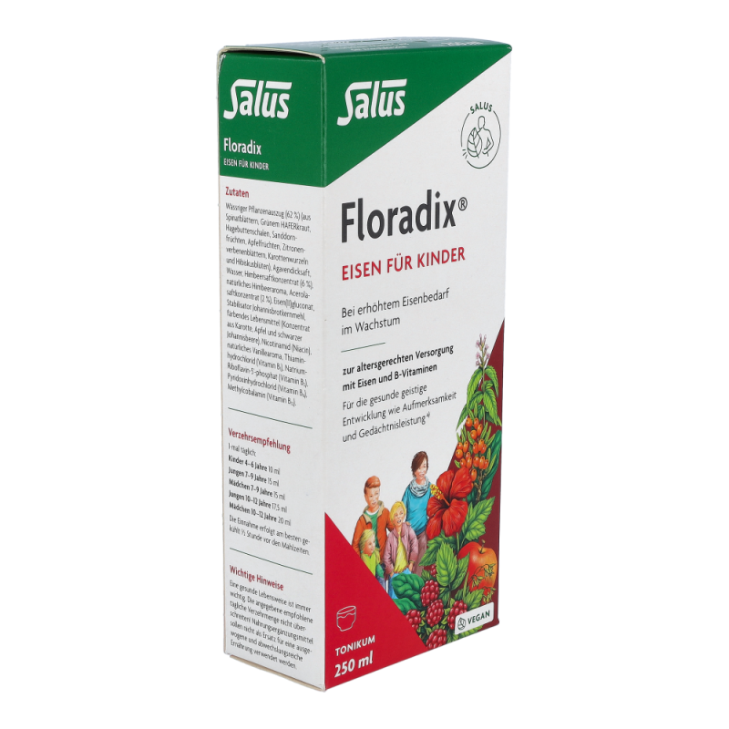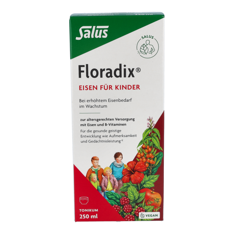Floradix-EisenTonikum für Kinder mit leckerem Himbeersaft und natürlichen Kräuterextrakten. Es dient zur optimalen Eisen-Aufnahme (Eisen(II)gluconat) mit natürlichem Vitamin aus der Acerolakrische.