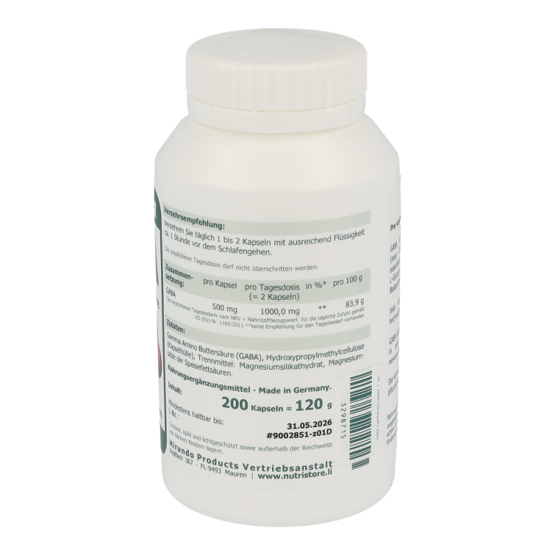 The Nutri Store GABA Gamma Amino Buttersäure Kapseln – GABA steht für Gamma Amino Buttersäure (engl. Gamma Amino Butyric Acid), eine nicht essentielle Aminosäure, die der Körper aus L-Glutamin herstellt. Jede vegetarische GABA Kapsel enthält 500 mg hochwertige reine Gamma Amino Buttersäure.