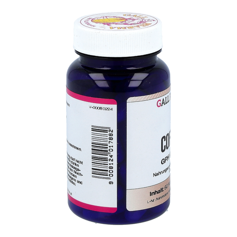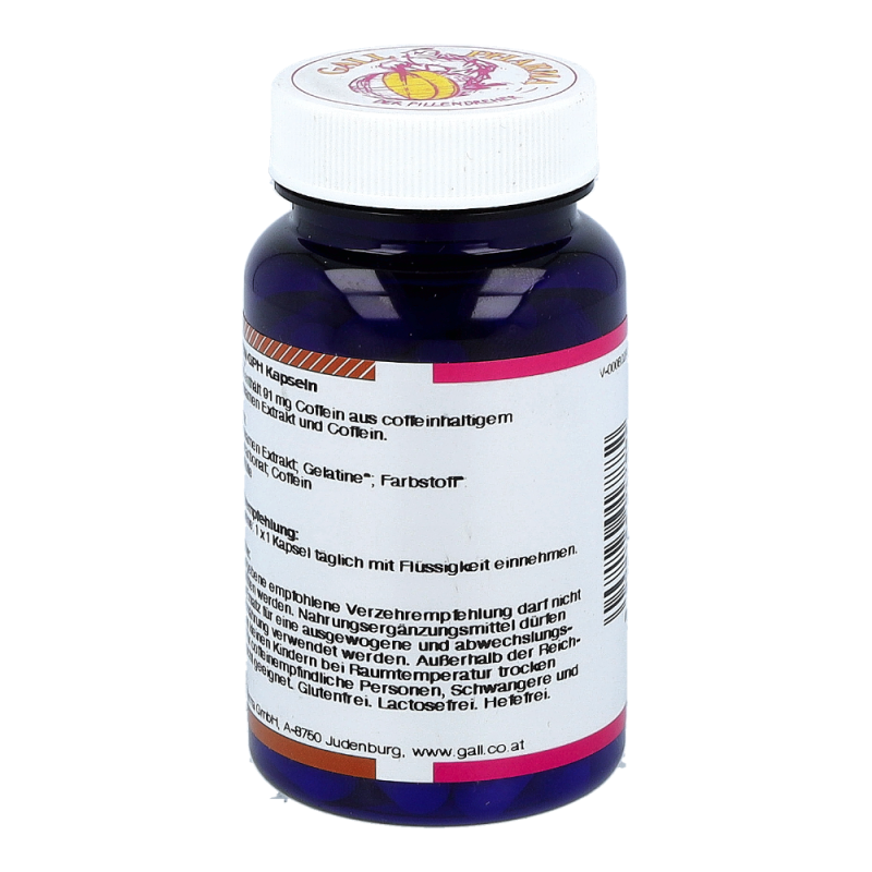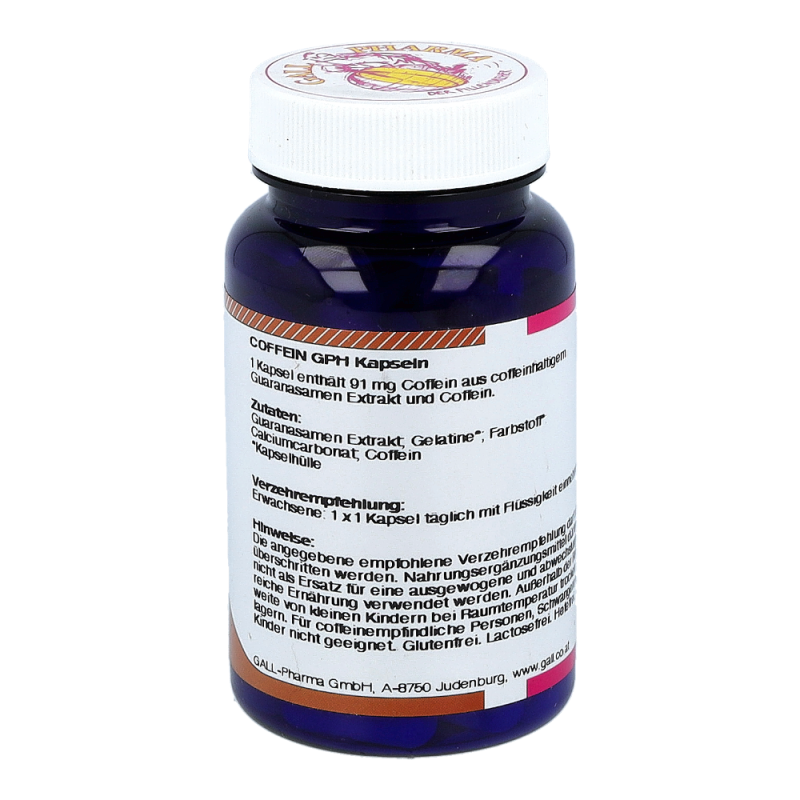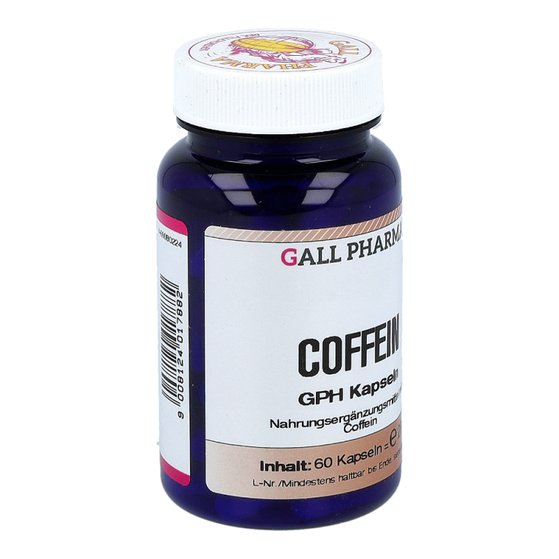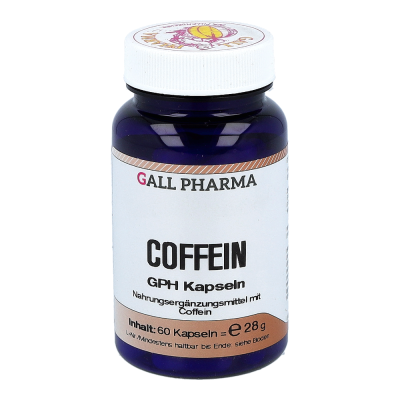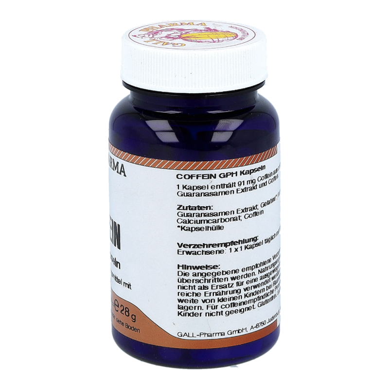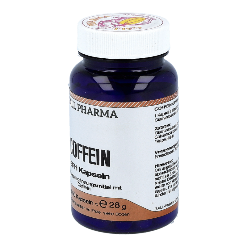 Coffein GPH Kapseln enthalten 60 mg Coffein und 310 mg Guaranasamen Extrakt mit einem Gesamtcoffeingehalt von 91 mg. Coffein und Guarana können dem Körper in Zeiten erhöhter geistiger und körperlicher Anstrengung sowie in Stresssituationen kurzfristig Energie zuführen. Coffein hat eine schnell zentral anregende Eigenschaft, das Coffein aus Guarana wird erst nach und nach aufgenommen. Dieses Produkt erhalten Sie in den Packungsgrößen 60 und 120 Stück.