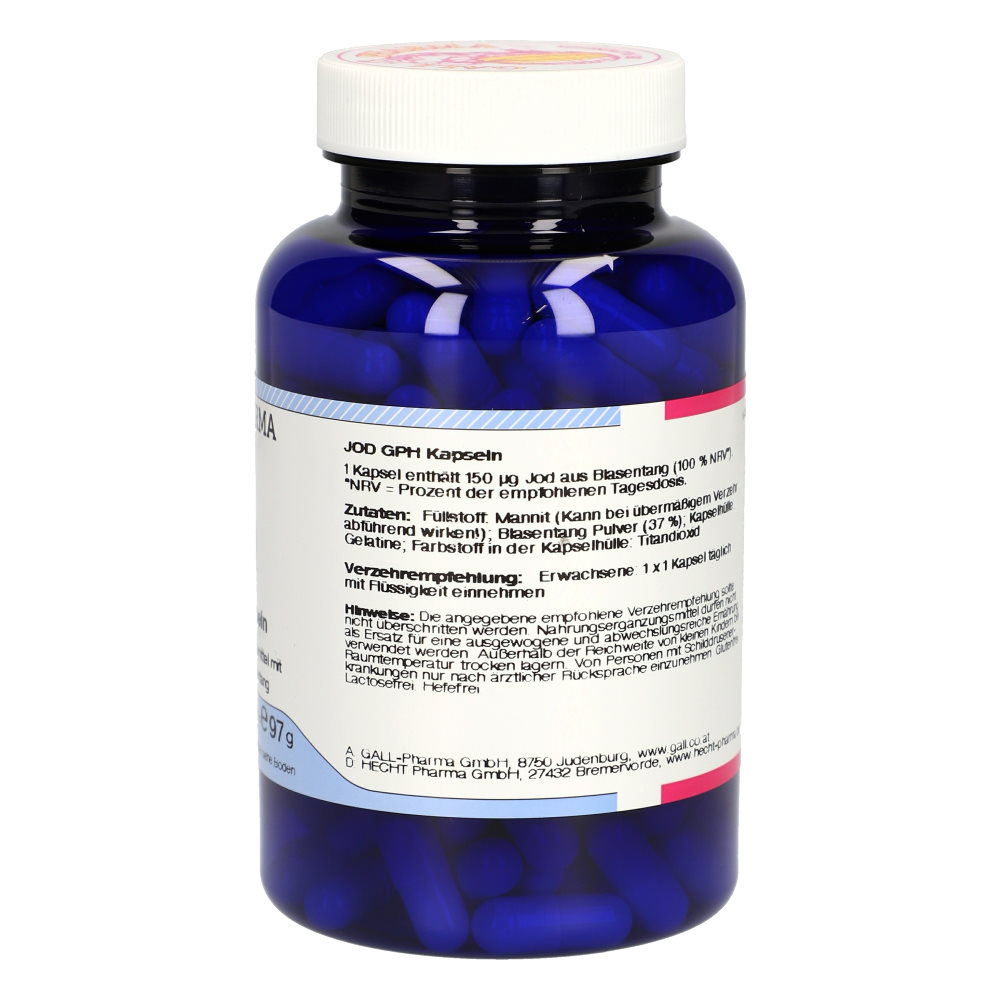 Bei Jod GPH Kapseln 180 Stk. ist der Hauptinhaltsstoff das Blasentag Pulver. Der Blasentang (Fucus vesiculosus) ist eine Braunalge aus dem Atlantik. Blasentang ist reich an Vitaminen, Mineralstoffen und eine natürliche Quelle für das Spurenelement Jod. Jod ist ein lebenswichtiges Spurenelement, welches für den Aufbau der jodhaltigen Schilddrüsenhormone benötigt wird. Diese spielen unter anderem eine wichtige Rolle in der Wachstumsphase, im Energiestoffwechsel und bei der Entwicklung vieler Organe, besonders der des Gehirns. Bei Symptomen eines Jodmangels, wie zum Beispiel Antriebslosigkeit, Gewichtszunahme und Müdigkeit, können die Jod GPH Kapseln die Ernährung sinnvoll ergänzen.