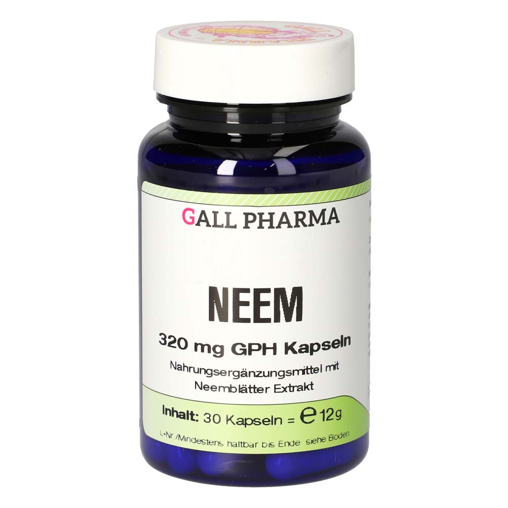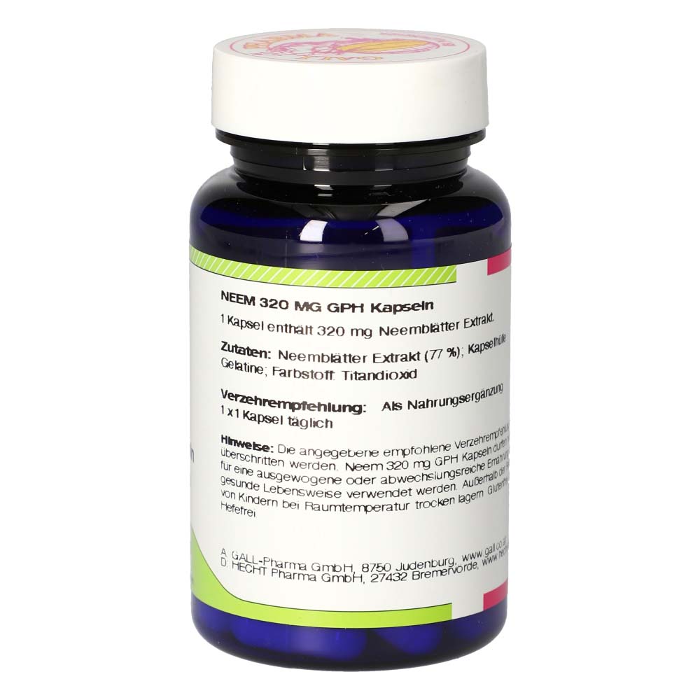 Neem 320 mg GPH Kapseln enthalten 320 mg eines Neemblätter Extraktes, das einen positiven Einfluss auf die Verdauung hat und beim Abtransport von Giftstoffen aus der Leber hilft. Zudem gelten die Blätter als allgemein immunstärkend und können das körpereigene Abwehrsystem bei Angriffen aktivieren. Letztendlich können Extrakte aus Neemblätter Einfluss auf den Zuckerstoffwechsel haben, was insulinpflichtigen Diabetikern zur Unterstützung empfohlen werden kann.