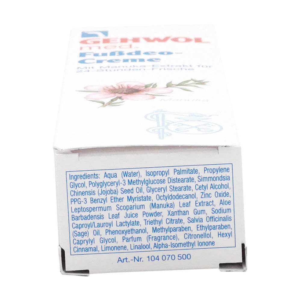 Gehwol med Fußdeo-Creme mit neuem, angenehmem Duft kombiniert den hochkonzentrierten Wirkstoffextrakt des Manuka-Öls mit mikronisiertem Zinkoxid zur Beseitigung von starkem Fußgeruch für mindestens 24 Stunden in einer pflegenden Cremegrundlage mit Jojoba-Öl und Aloe Vera.