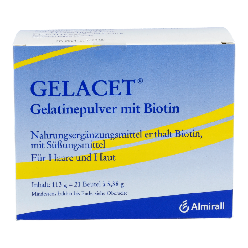 Gelacet Pulver + Biotin Beutel sorgt für eine angemessene Zufuhr von Biotin, welches eine große Rolle für Haare, Haut und Nägel spielt. Es fördert das Wachstum von Zellen und schützt diese vor äußeren Einflüssen.