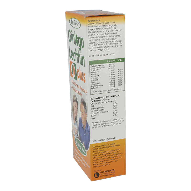 "100 ml GINKGO LECITHIN PLUS Dr. Fischer enthalten: Brennwert: 769 KJ (184 kcal) Eiweiß: 0 g Kohlenhydrate: 7 g Fett: 9 g Zutatenliste: Wasser, Ethanol, Sojalecithin, Fruchtzucker, Verdickungsmittel Polyethylenglykol 6000 (E468), Ginkgofluidextrakt, Farbstoff Zuckercouleur, Aromen, Natriumcitrat, Konservierungsmittel Kaliumsorbat, Nicotinamid, Vitamin E wassermischbar, Dexpanthenol, Riboflavinphosphat-Natrium, Pyridoxinhydrochlorid, Thiaminchloridhydrochlorid, Biotin, Folsäure und Vitamin B12. Alkoholgehalt: ca. 16 % V/V"