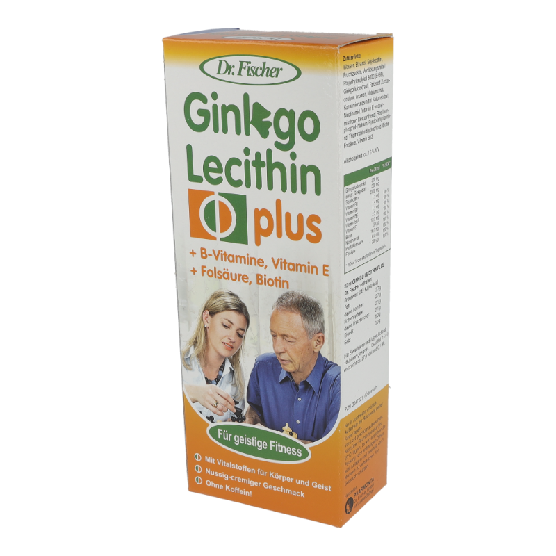"Nahrung fürs Gehirn! GINKGO LECITHIN PLUS Dr. Fischer ist ein Nahrungsergänzungsmittel für Beruf, Alltag und Sport mit wertvollen Vitalstoffen für Körper und Geist. + B-Vitamine + Vitamin E + Folsäure + Biotin Dieses nussig-wohlschmeckende Tonikum enthält pro Tagesdosis 300 mg Ginkgofluidextrakt hergestellt aus garantiert pharmazeutisch kontrolliertem Anbau (GACP). Ginkgo wird in Asien seit Jahrhunderten wegen seiner Lebenskraft als Tempelbaum verehrt, da er als kraftspendend und lebensverlängernd gilt. Gentechnikfreie Sojabohnen liefern das hochwertige Sojalecithin. Sowohl das Ginkgoblatt als auch das Sojalecithin weisen Arzneibuchqualität auf. GINKGO LECITHIN PLUS Dr. Fischer enthält auch noch wertvolle B-Vitamine, Vitamin E, Biotin und Folsäure."