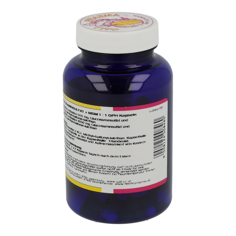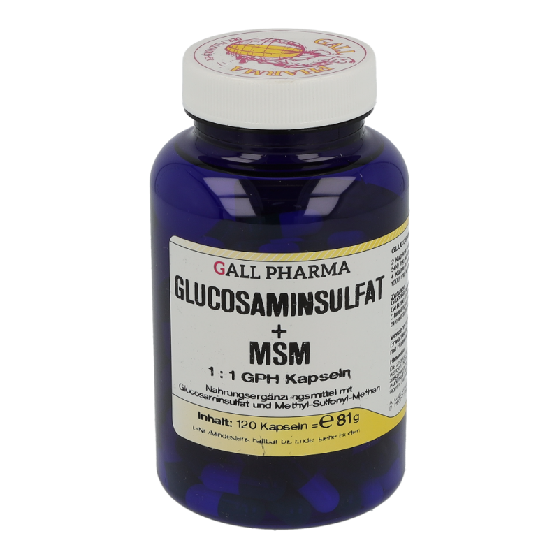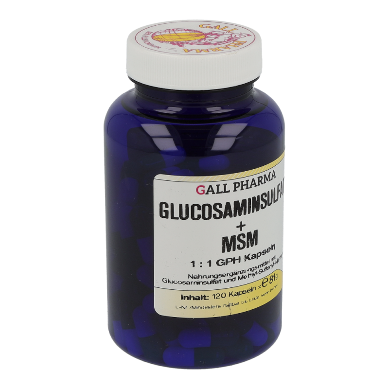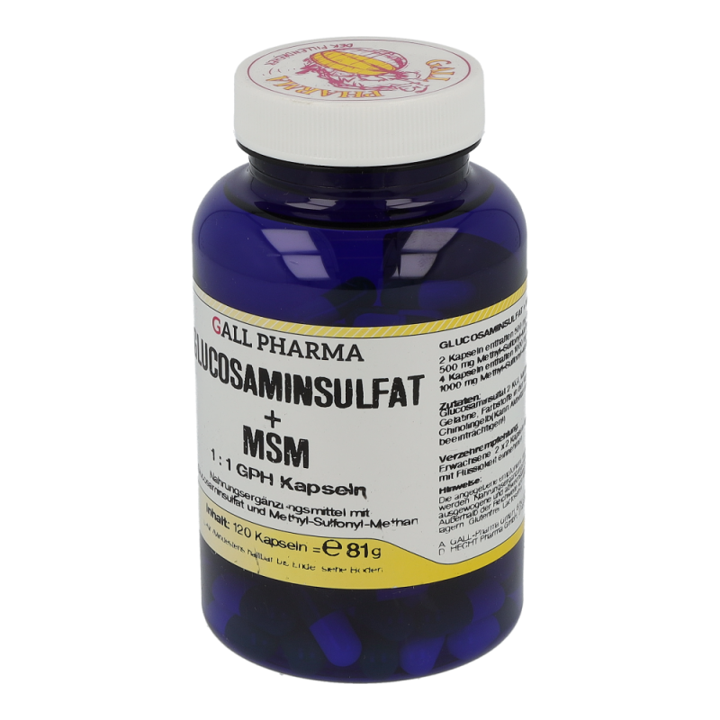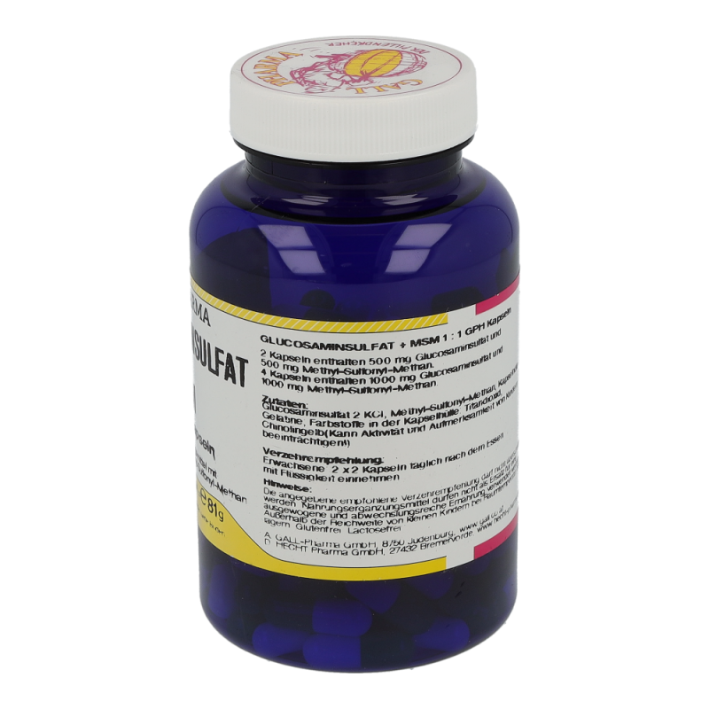 Glucosaminsulfat + MSM 1:1 GPH Kapseln enthalten 250 mg D-Glucosaminsulfat als Kaliumsalz und 250 mg MSM in einer Hartgelatinekapsel.