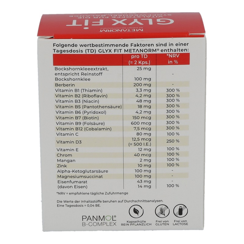 GLYX FIT Kapseln METANORM® liefern dem Körper die notwendigen Mikronährstoffe, um die Aktivität der Enzymsysteme, die für den Stoffwechsel von Eiweiß, Kohlenhydraten und Fetten verantwortlich sind, anzukurbeln. Zusätzlich enthalten GLYX FIT Kapseln METANORM® Pflanzenstoffe, welche direkt den Blutzuckerspiegel beeinflussen. Gleichzeitig wird der Energiestoffwechsel effizient unterstützt.