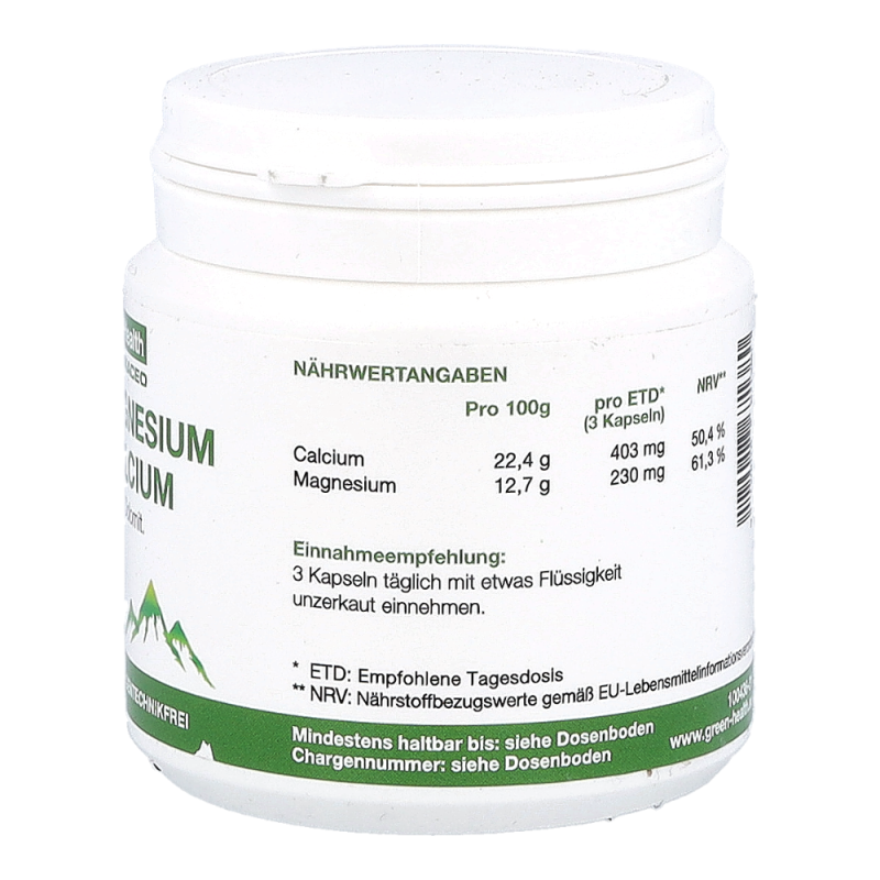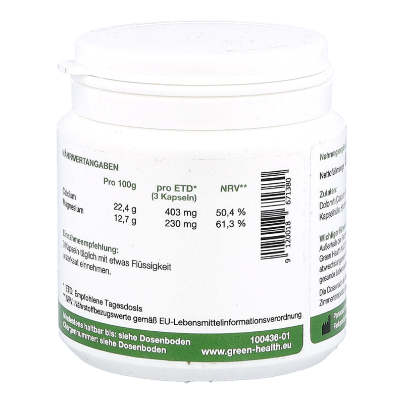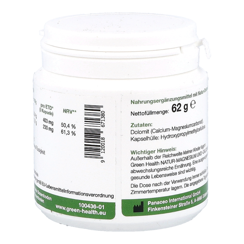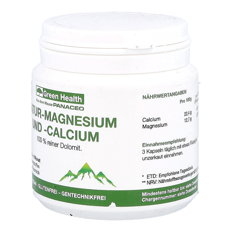 Green Health Natur-Magnesium und -Calcium ist ein fein vermahlenes Gesteinspulver aus Dolomit, welches neben der normalen Ernährung die Deckung des täglichen Calcium- und Magnesiumbedarfs aus einer natürlichen Quelle unterstützt und aus Urmeer-Korallen gewonnen wird. Green Health Natur-Magnesium und -Calcium stärkt Knochen und Zähne und unterstützt die normale Muskelfunktion und das Nervensystem sowie die Signalübertragung zwischen den Nervenzellen.