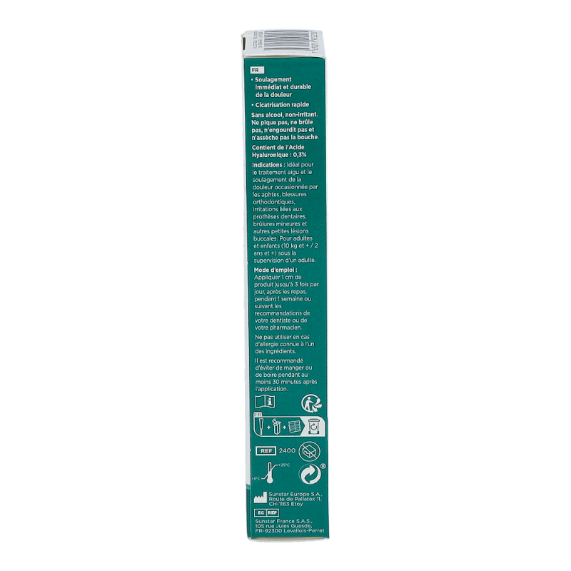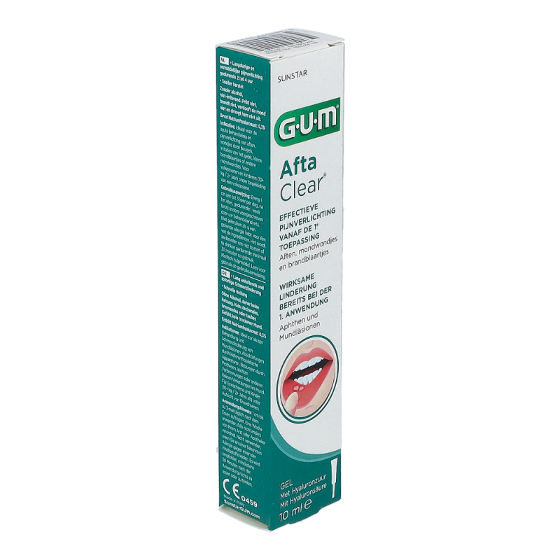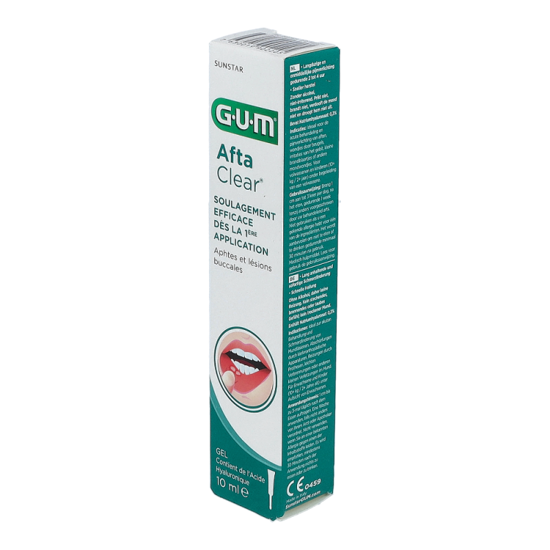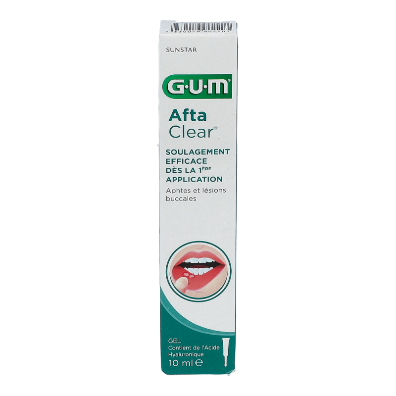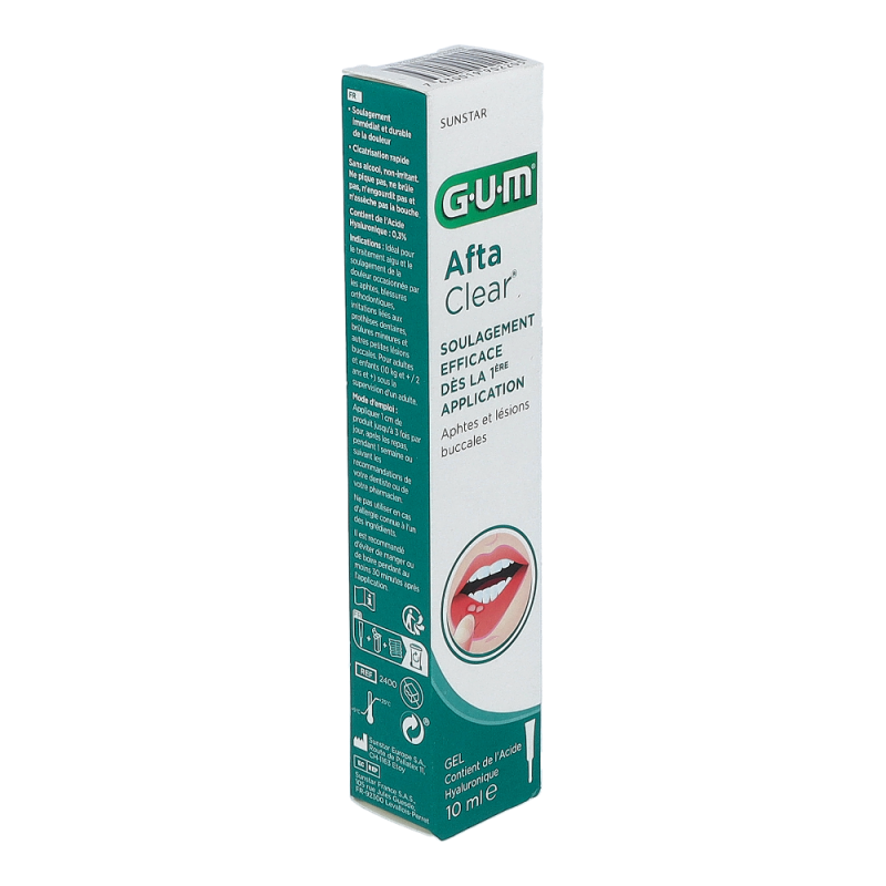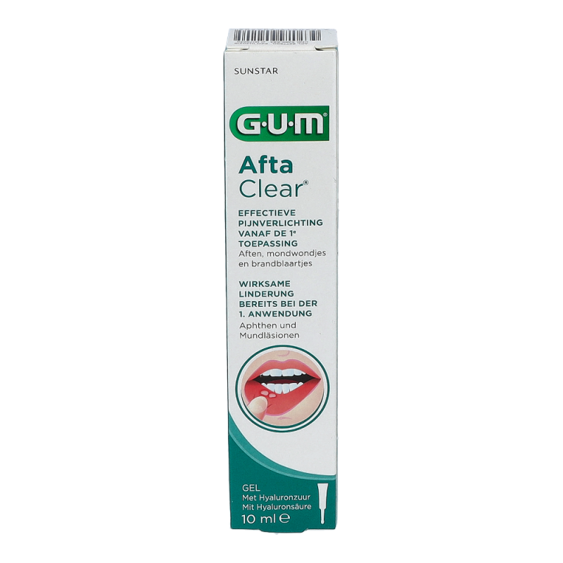 GUM® AftaClear® Gel ist ideal zur Behandlung von akuten Mundläsionen,Abschürfungen durch kieferorthopädische Apparaturen,Reizungen durch Prothesen, kleinere Wunden oderandere kleine Verletzungen im Mund.Einfache Handhabung und Aufbringen durch denextralangen Applikator.Enthält 0,3 % Hyaluronsäure.