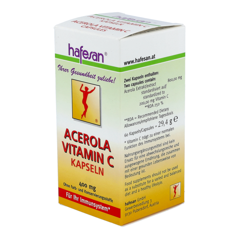hafesan Acerola Vitamin C versorgt Ihren Körper mit natürlichem Vitamin C aus der Acerolakirsche. Gerade im Winter, bei Rauchern, in Stress-Situationen und bei hoher körperlicher Belastung steigt der Vitamin C Bedarf
