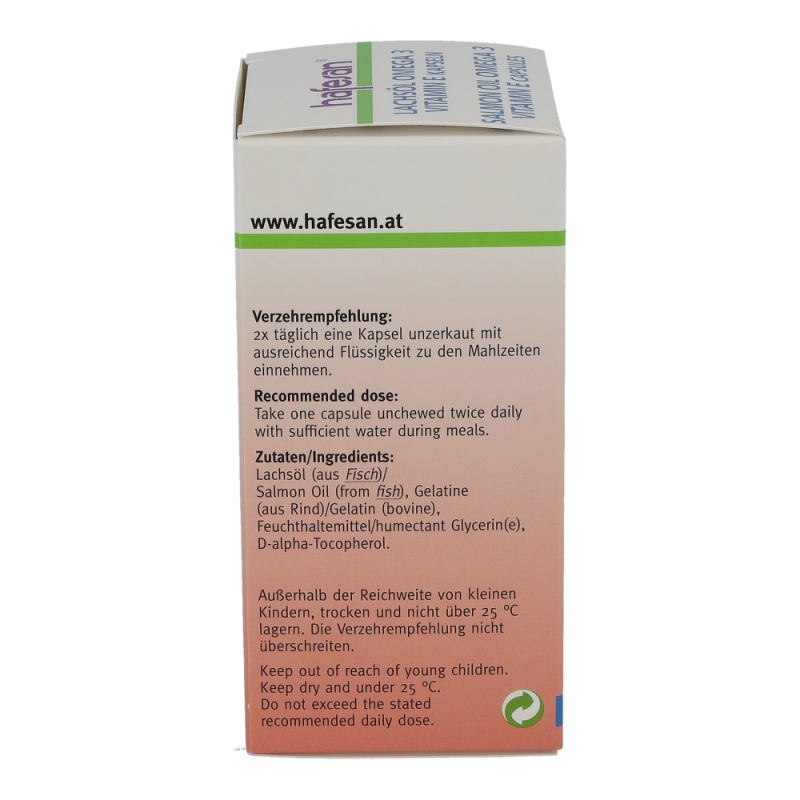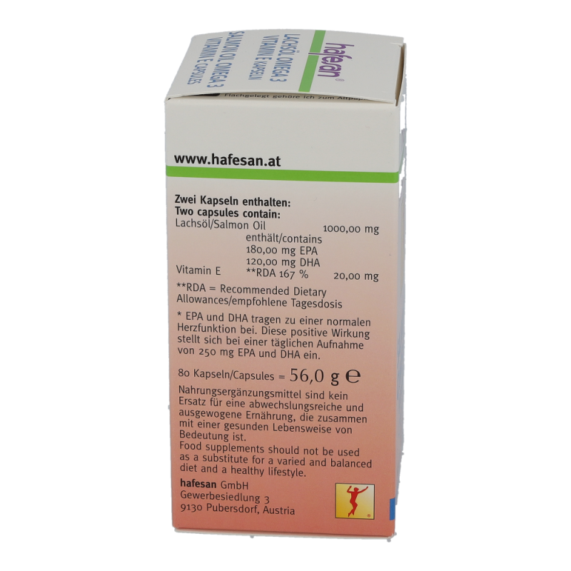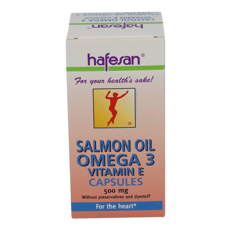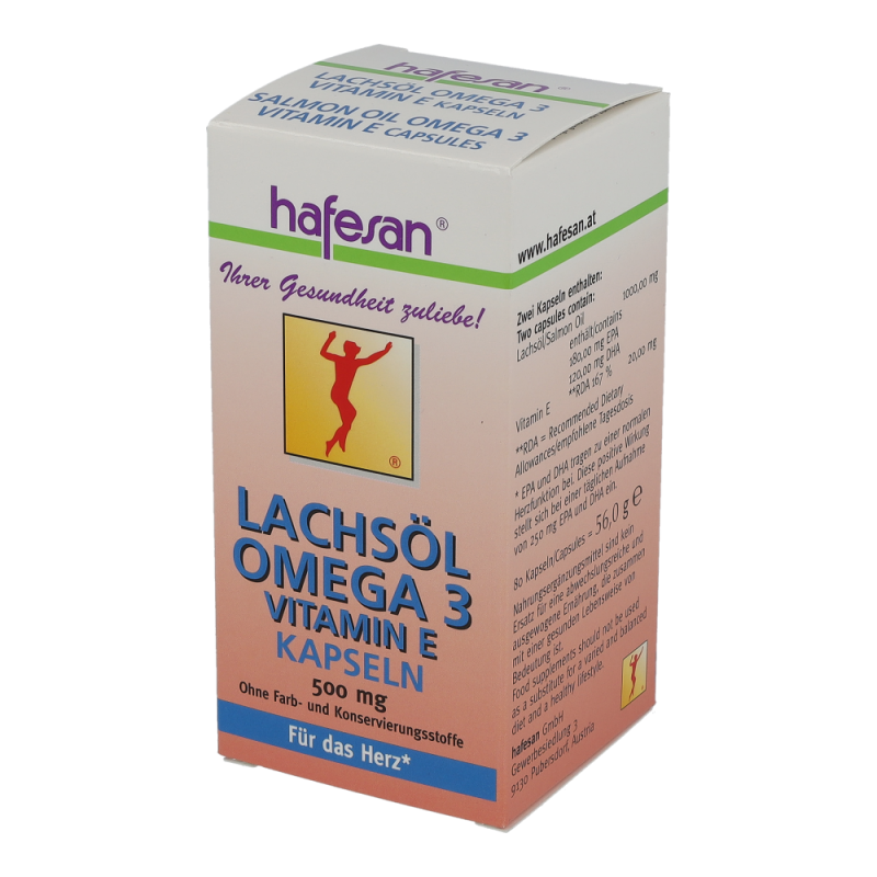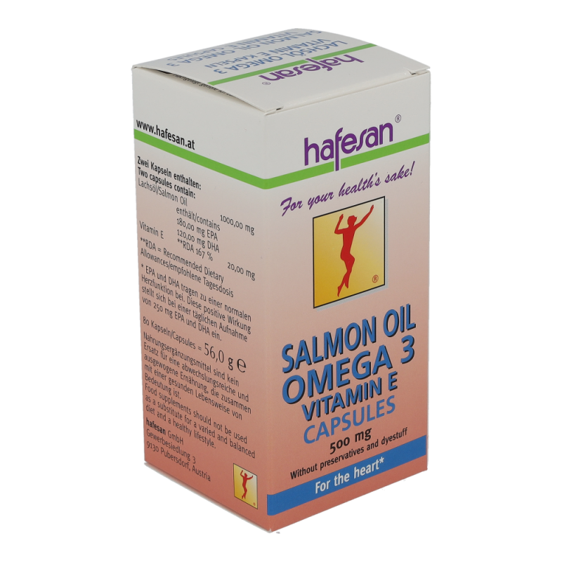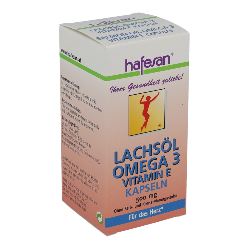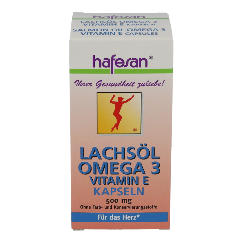 Hafesan® Lachsöl Omega 3 + Vitamin E Kapseln enthalten die Omega 3-Fettsäuren EPA und DHA. Diese sind wichtig für den Erhalt der Gehirnfunktion und der Sehkraft und leisten einen wichtigen Beitrag zu einer normalen Herzfunktion.