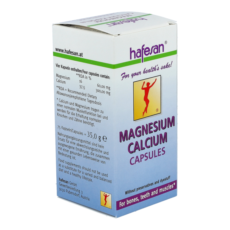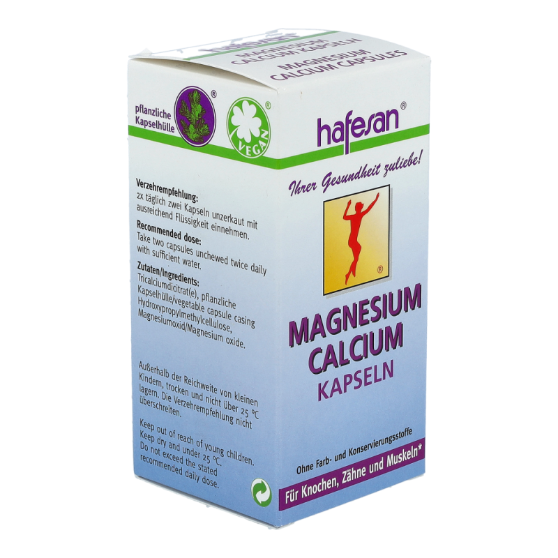 Hafesan® Magnesium Calcium Kapseln unterstützen den Körper bei der Erhaltung von Knochen und Zähnen, und leisten einen Beitrag zur Funktionsfähigkeit der Muskeln und des Nervensystems.
