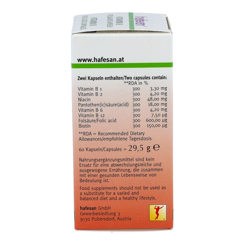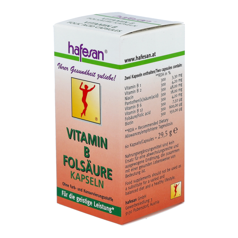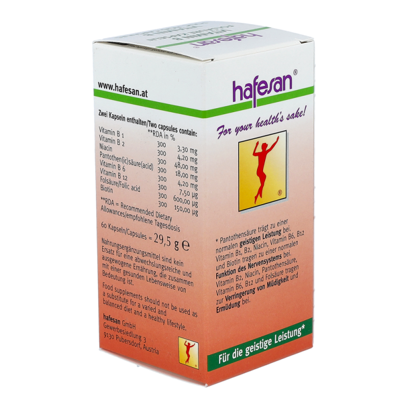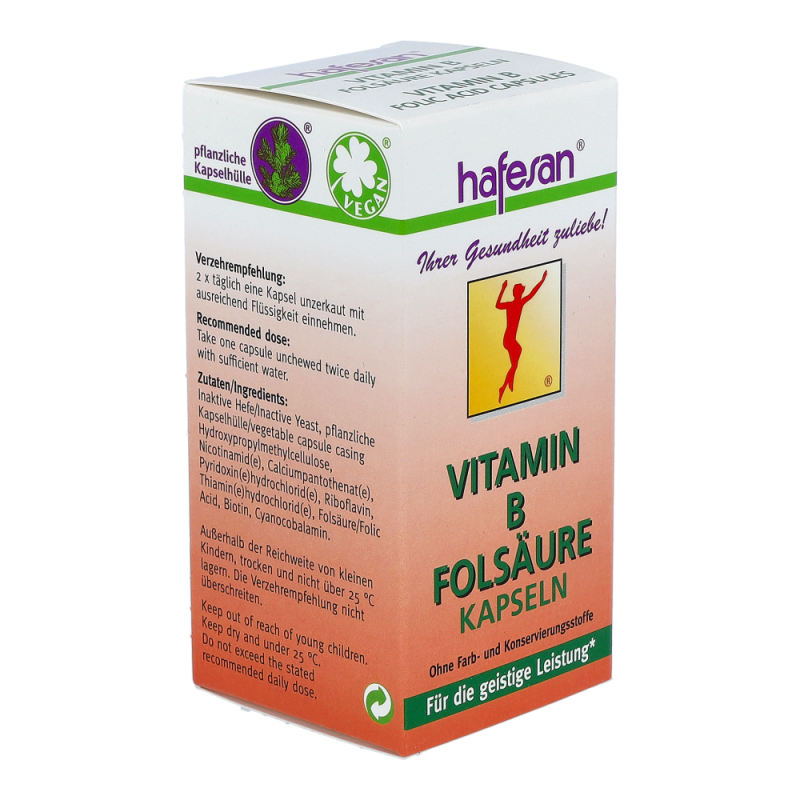 Die in Hafesan® Vitamin B + Folsäure + Biotin Kapseln enthaltenen B-Vitamine erfüllen im menschlichen Körper zahlreiche lebenswichtige Aufgaben. Sie unterstützen unter anderem das Immunsystem, sind wichtig für Haut und Schleimhäute und tragen zur Funktionsfähigkeit des Nervensystems bei – versandkostenfreie* Lieferung nutzen!