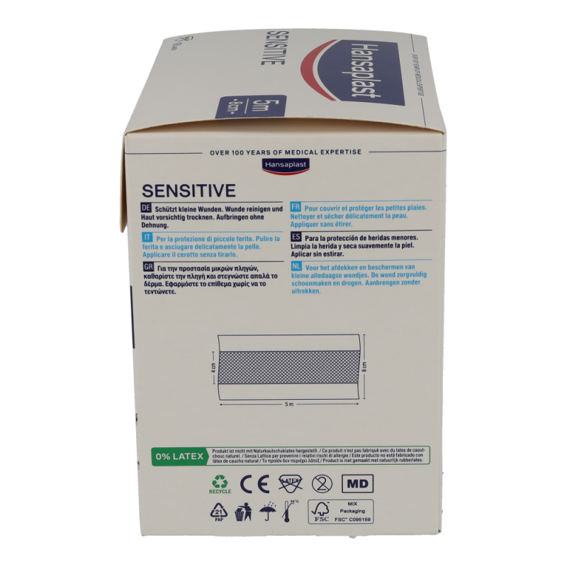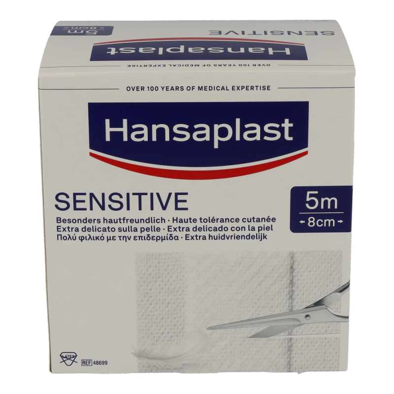 Die nicht verklebende Wundauflage schützt und polstert die Wunde. Dank der zuverlässigen Klebkraft bieten die Pflaster sicheren Halt und verrutschen nicht. Hansaplast Sensitive Meterware und Hansaplast Sensitive Injektionspflaster sind latexfrei."