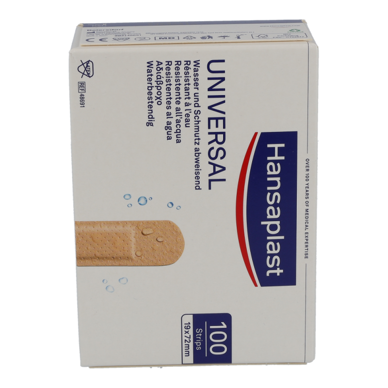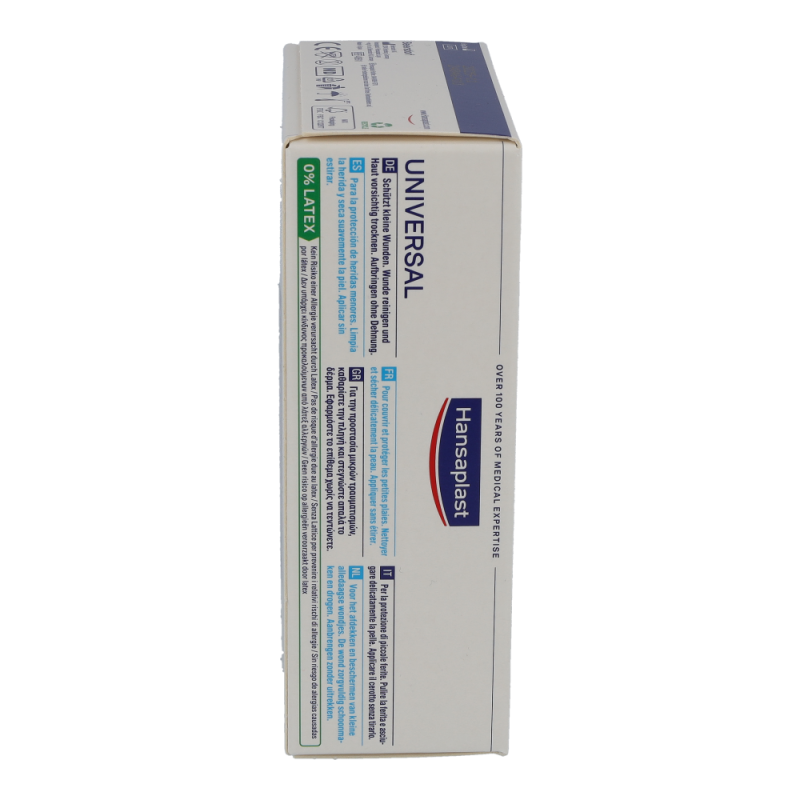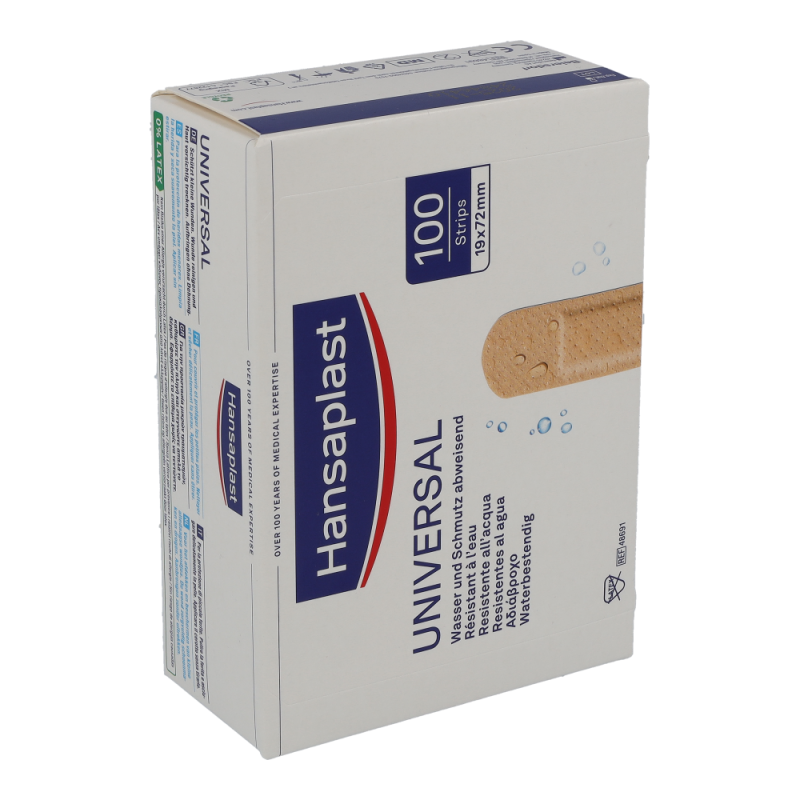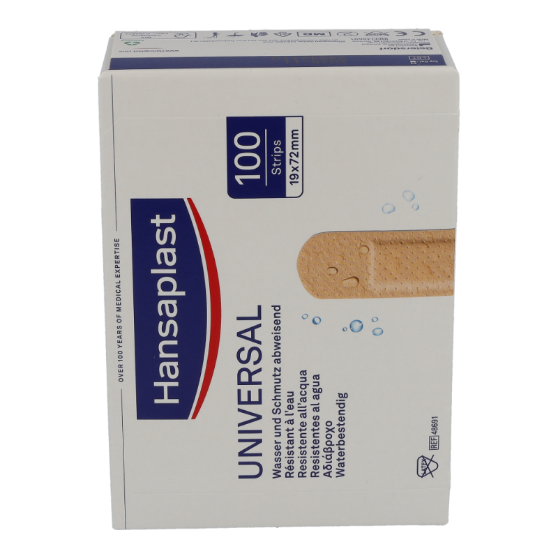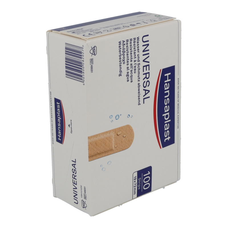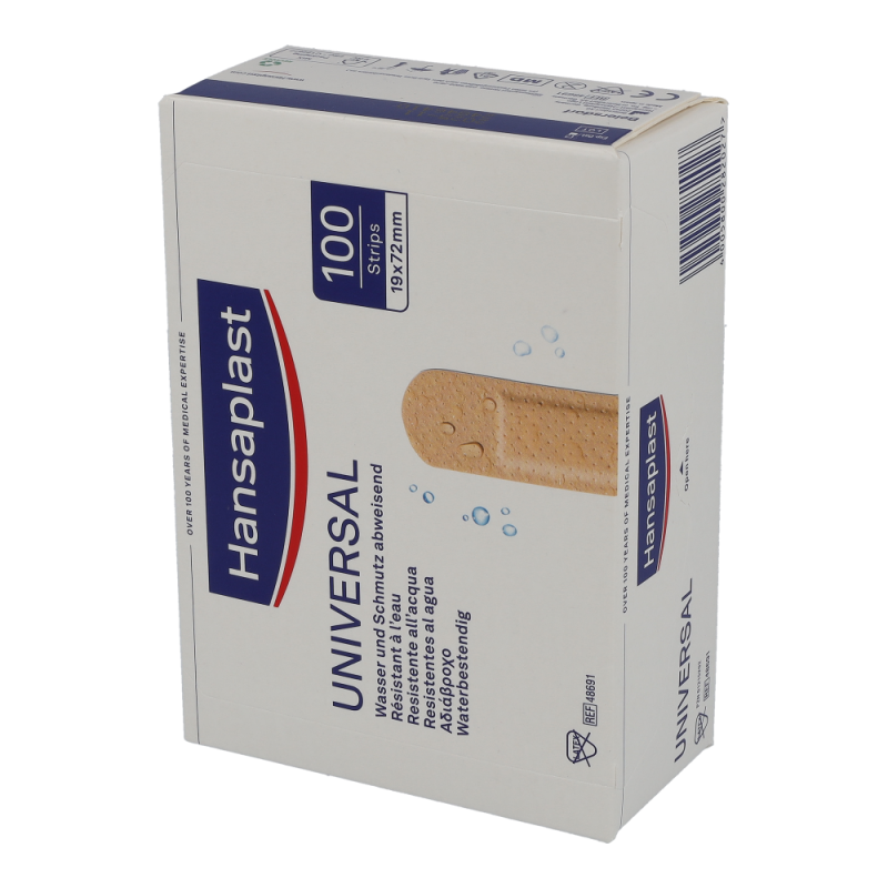 Hansaplast Universal besteht aus wasser- und schmutzabweisendem, aber gleichzeitig hautfreundlichem, atmungsaktivem Material und ist zur Versorgung kleiner Verletzungen geeignet, besonders wenn Verletzungen Schmutz und Feuchtigkeit ausgesetzt sind. Dank starker Klebkraft schützt es die Wunde zuverlässig. Die nicht verklebende Wundauflage schützt und polstert die Wunde.