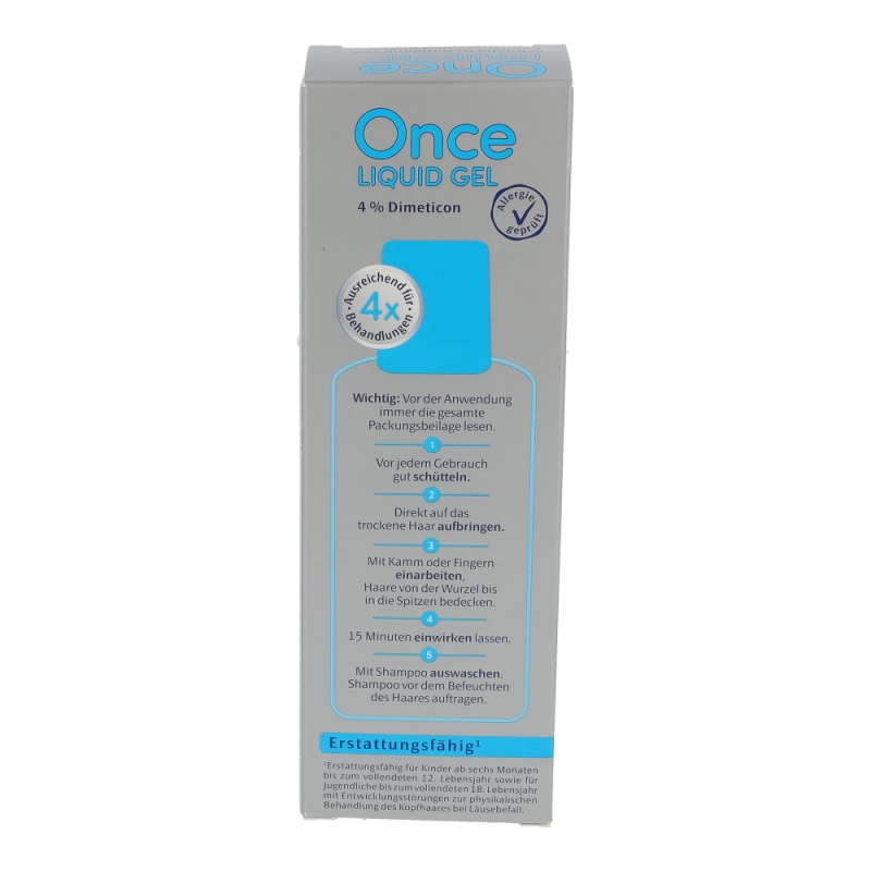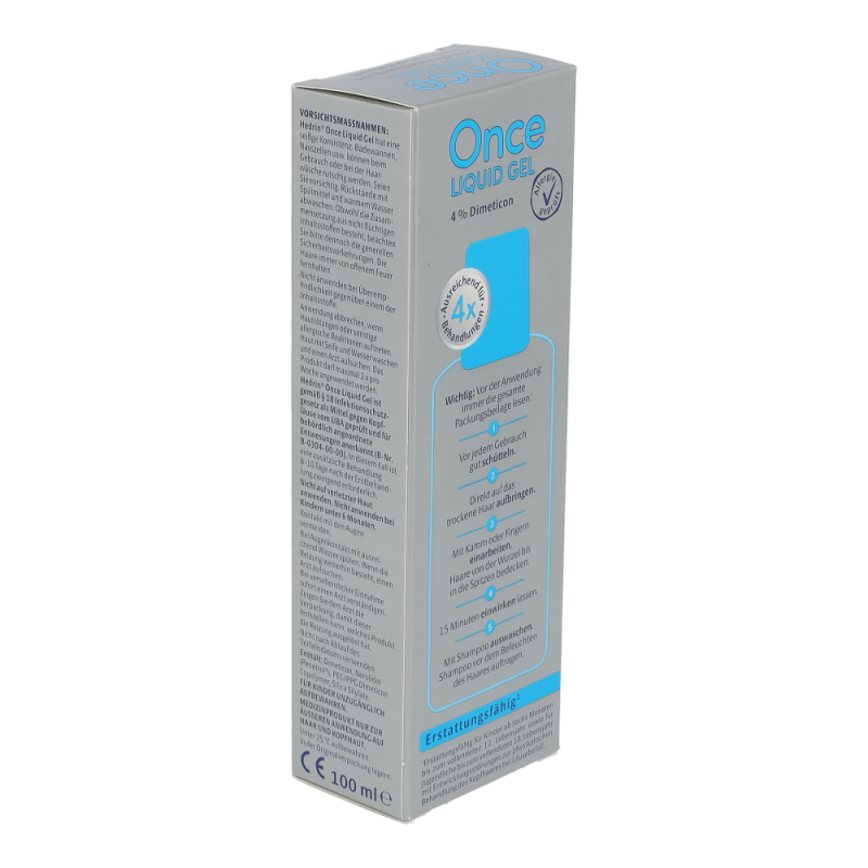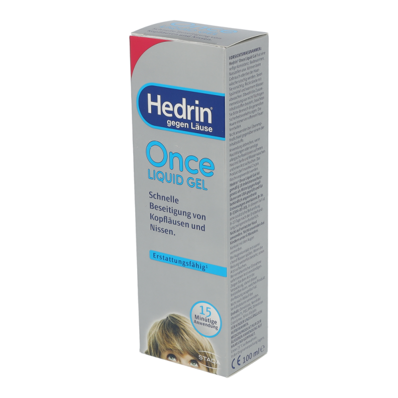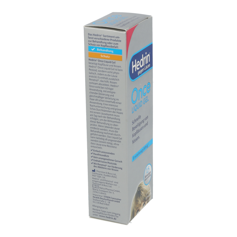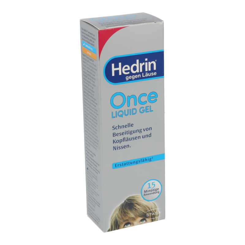 Wer unter Kopfläusen leidet, sollte schnell handeln, um eine weitere Ausbreitung zu verhindern. Dabei hilft Hedrin® Once Liquid Gel. Mit dem patentierten Inhaltsstoff Penetrol® und 4 % Dimeticon bekämpft das Präparat Läuse und Nissen auf physikalische Weise – und kommt dabei ohne Pestizide aus. Hedrin Once Liquid Gel hat eine Einwirkzeit von 15 Minuten und wirkt bereits nach nur einer Anwendung. Dabei ist das Gel besonders hautfreundlich und gut verträglich, sodass es auch bei Kindern ab 6 Monaten angewendet werden kann.