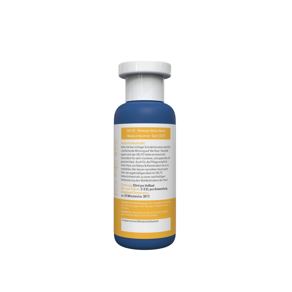 Hafer hat – bei richtiger Extraktion – eine natürlich rückfettende Wirkung auf die Haut. Deswegen eignet sich der HELFE Haferstrohextrakt besonders für sehr trockene, schuppende und gereizte Haut. Bei juckender Haut, Hautausschlag oder Schuppenbildung kann er angewandt werden. Auch für die Pflege der empfindlichen Haut von Babys & Kleinkindern ist es zu empfehlen. Bei diesen sensiblen Hauttypen führt ein regelmäßiges Bad mit HELFE Haferstrohextrakt zu einer nachhaltigen Verbesserung des Wohlbefindens der Haut.