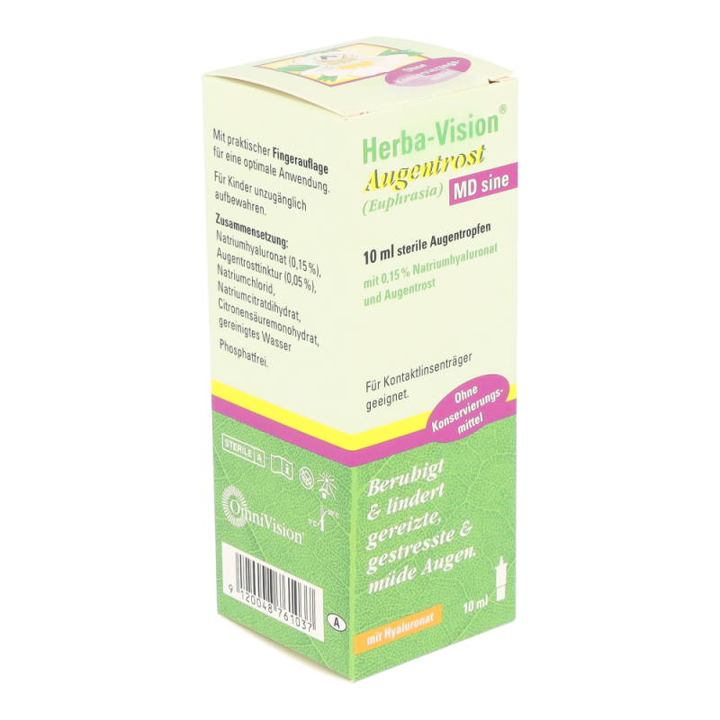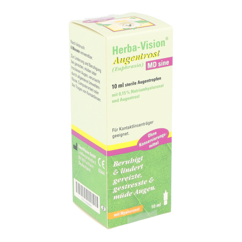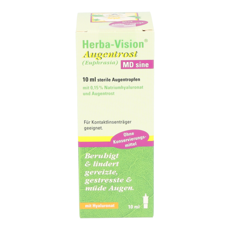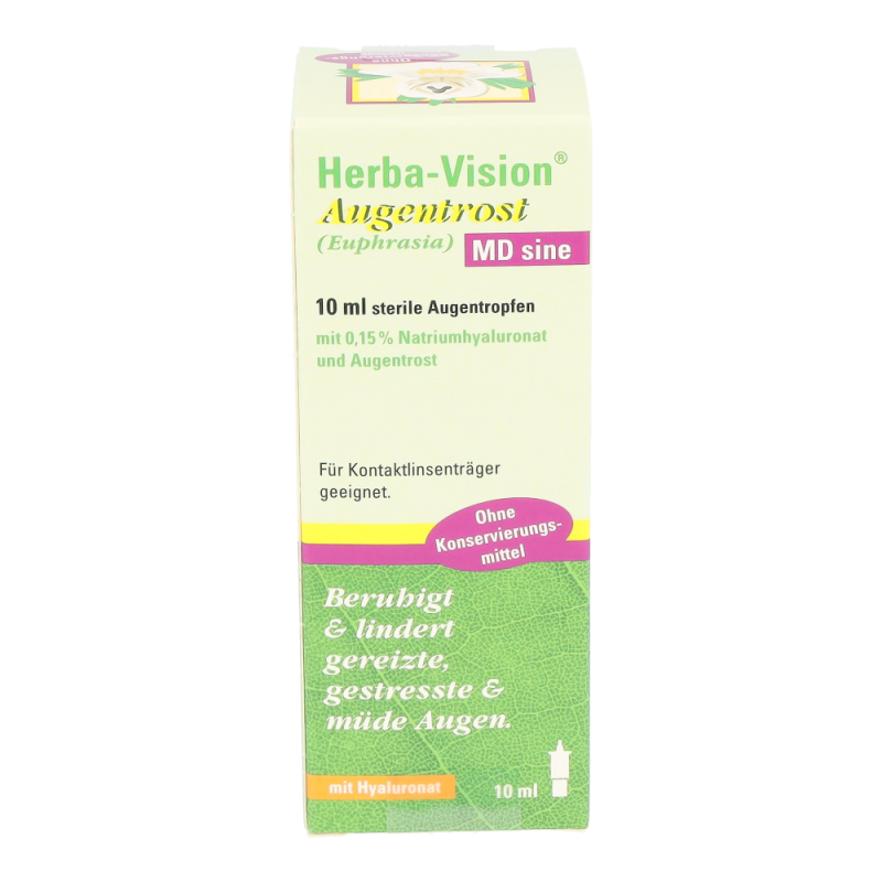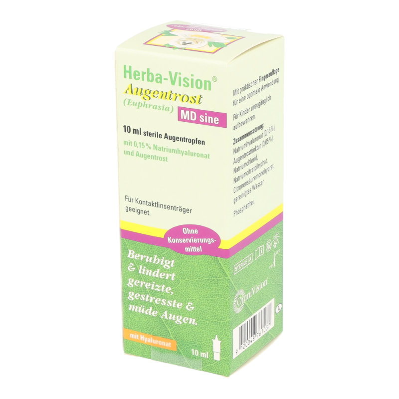 Herba-Vision Augentrost MD sine 10 ml bringt Linderung und beruhigt bei gereizten oder trockenen Augen, verursacht durch das Tragen von Kontaktlinsen, Müdigkeit, den Aufenthalt in verrauchten Räumen, langandauernde Computerarbeit oder Belastung durch allgemeine Umwelteinflüsse, wie zum Beispiel Staubpartikel und Pollen.