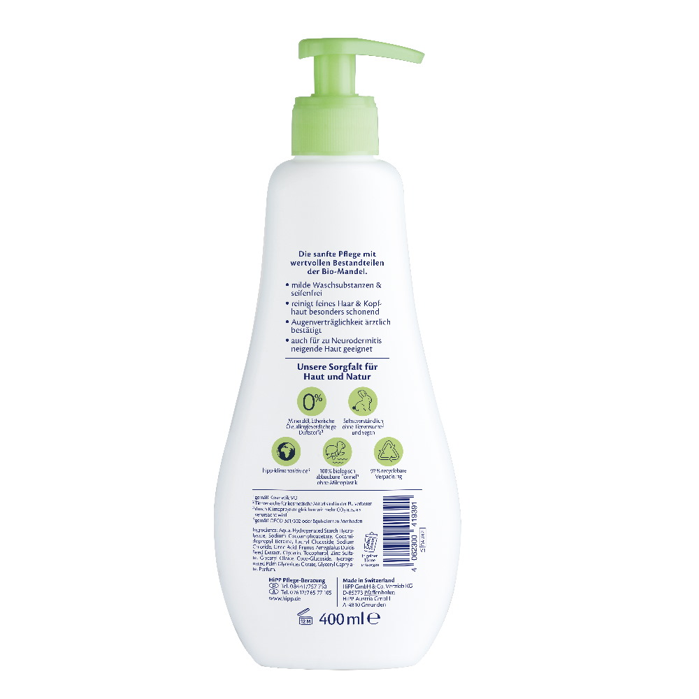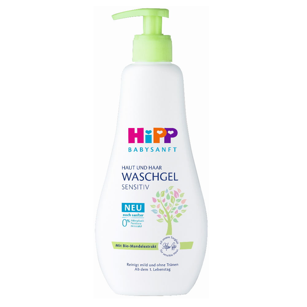 Das Hipp Babysanft Waschgel Haut & Haar pflegt Babyhaut sowie sensible Erwachsenenhaut und dient zur sanften Reinigung von feinem Haar. Um Allergie-Risiken zu minimieren enthält das Produkt kein Mineralöle, Konservierungsstoffe und Parabene und ist schon ab dem 1. Lebenstag anwendbar. Der enthaltene Bio-Mandelextrakt versorgt die Haut mit Nährstoffen und unterstützt ihren natürlichen Säureschutzmantel