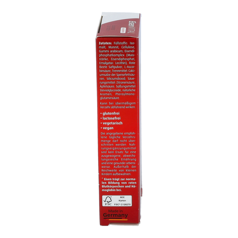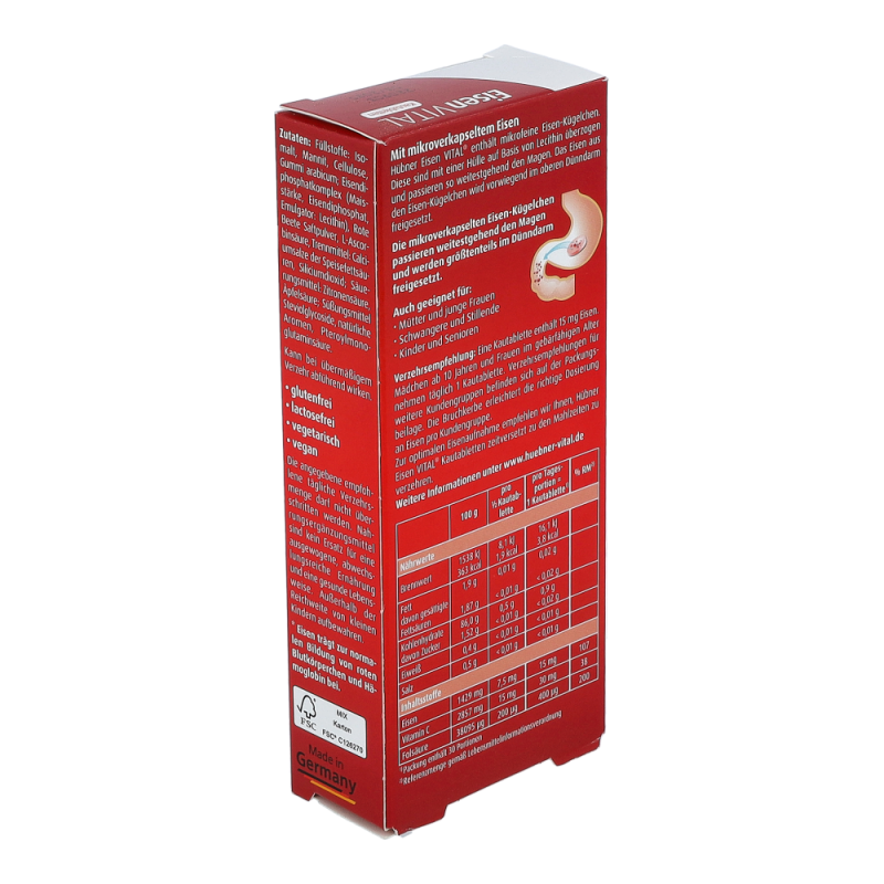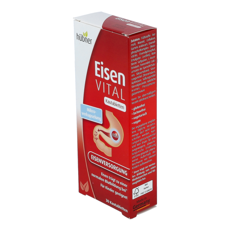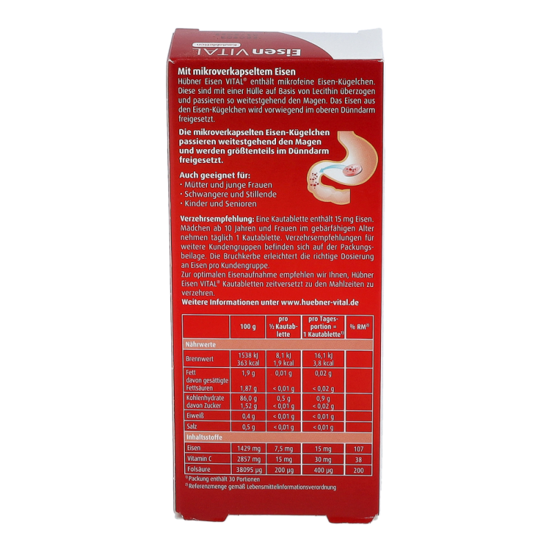 Hübner Eisenvital M Kautabletten enthält eine neue Generation an Eisen. Die mikrofeinen Eisen M+-Kügelchen sind mit einer Schutzhülle überzogen und passieren so weitestgehend geschützt den Magen, ohne die Schleimhaut anzugreifen. Das Eisen wird vorwiegend im oberen Dünndarm freigesetzt. So treten Magenreizungen praktisch nicht mehr auf.