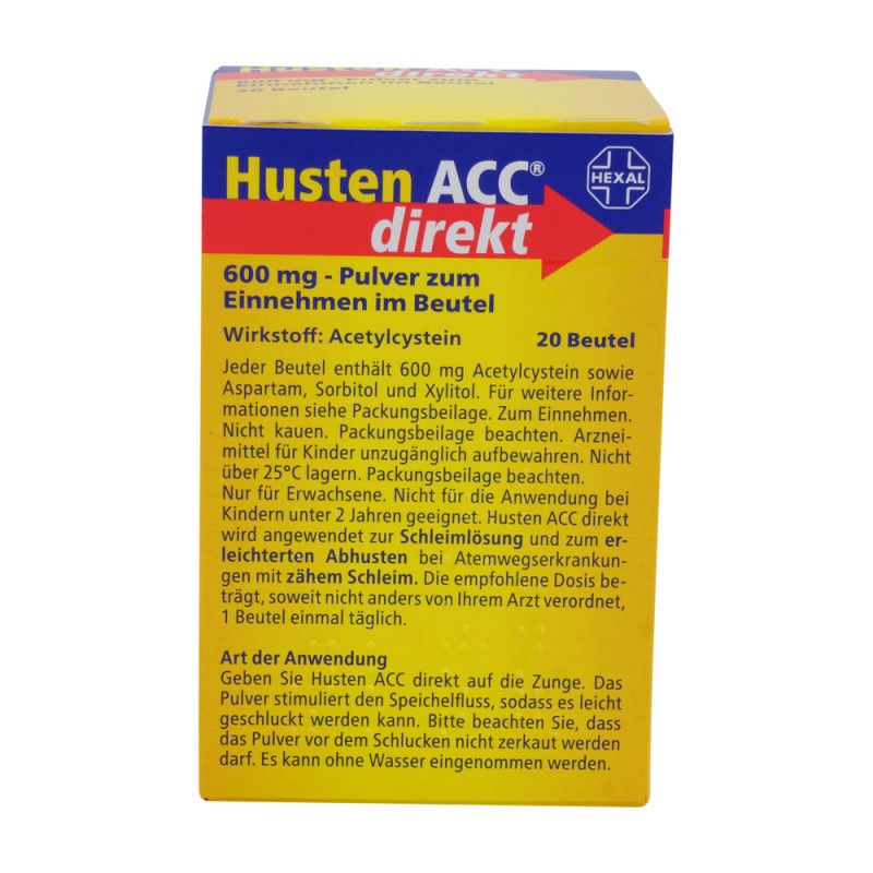 Im Gegensatz zu den bekannten Husten ACC Hexal® akut Brausetabletten wird Husten ACC® direkt mittels Direkt-Stick eingenommen. Das Pulver stimuliert den Speichelfluss, so dass es leicht geschluckt werden kann. Die Einnahme ist praktisch und einfach, ganz ohne Wasser – ideal für unterwegs, am Arbeitsplatz oder auf Reisen. Dadurch ist es ebenso für KundInnen geeignet, die Brausetabletten oder Hustensaft ablehnen. Das laktosefreie Husten ACC® direkt ist für Erwachsene ab 18 Jahren geeignet und schmeckt frisch-fruchtig nach Brombeeren. Empfohlen wird die Einnahme von einem Beutel einmal täglich, am besten morgens, damit die Schleimlösung und das Abhusten tagsüber ablaufen und der erholsame Schlaf nicht gestört wird. Für die Anwendung wird das Pulver aus dem Beutel direkt auf die Zunge geleert. Husten ACC® direkt sollte ohne ärztlichen Rat nicht länger als 14 Tage eingenommen werden.