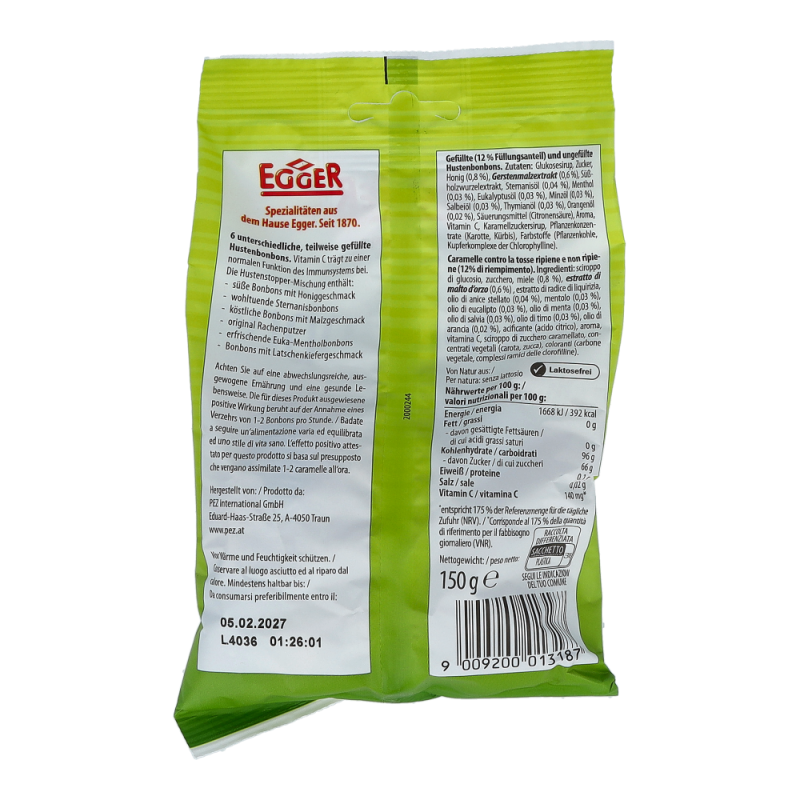 Diese einzigartige Hustenzuckerl-Mischung enthält sechs unterschiedliche, gefüllte Hustenzuckerl und ist perfekt für all jene, die Abwechslung lieben. Der Mix besteht aus süßen Zuckerl mit Honiggeschmack, wohltuenden Sternaniszuckerl, köstlichen Zuckerl mit Malzgeschmack, dem originalen kräftigen Rachenputzer, erfrischenden Euka-Mentholzuckerl und angenehmen Latschenkieferzuckerl. Egal für wen, vom sanften bis zum extra starken Hustenzuckerl ist in dieser Mischung alles vereint..