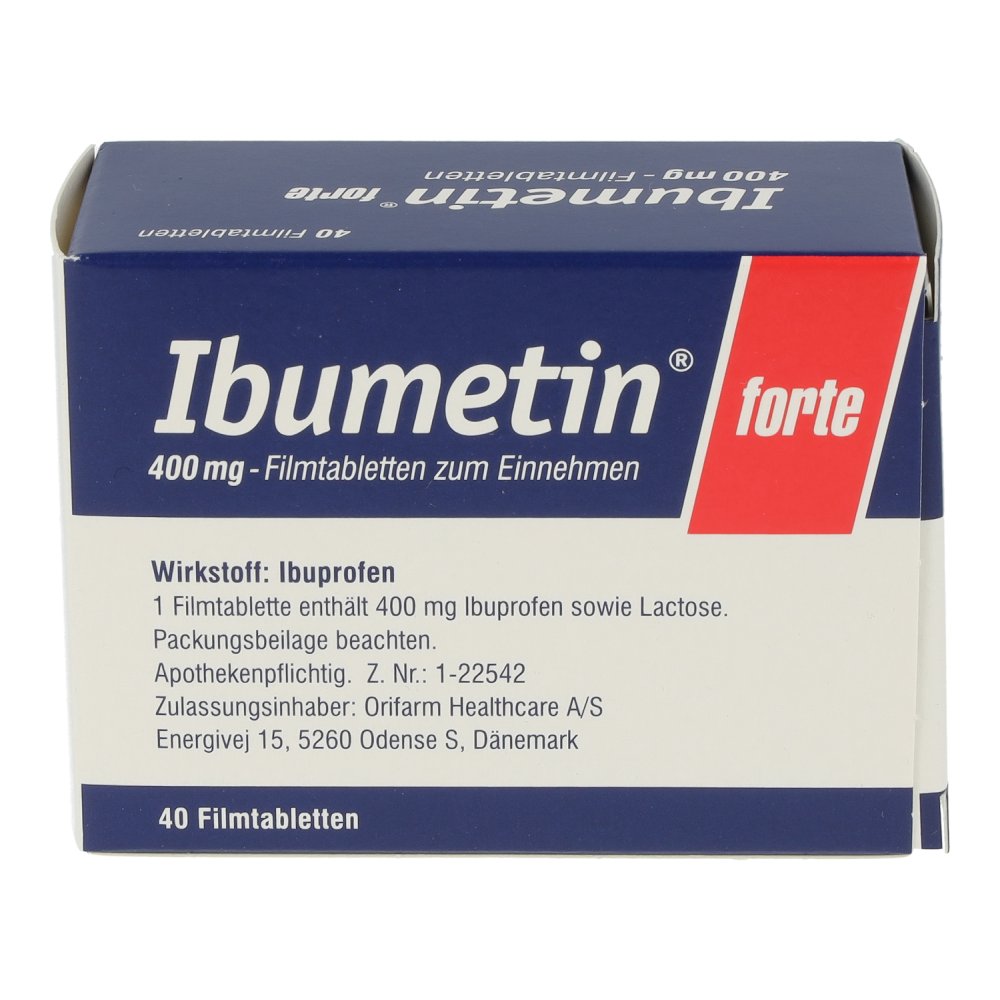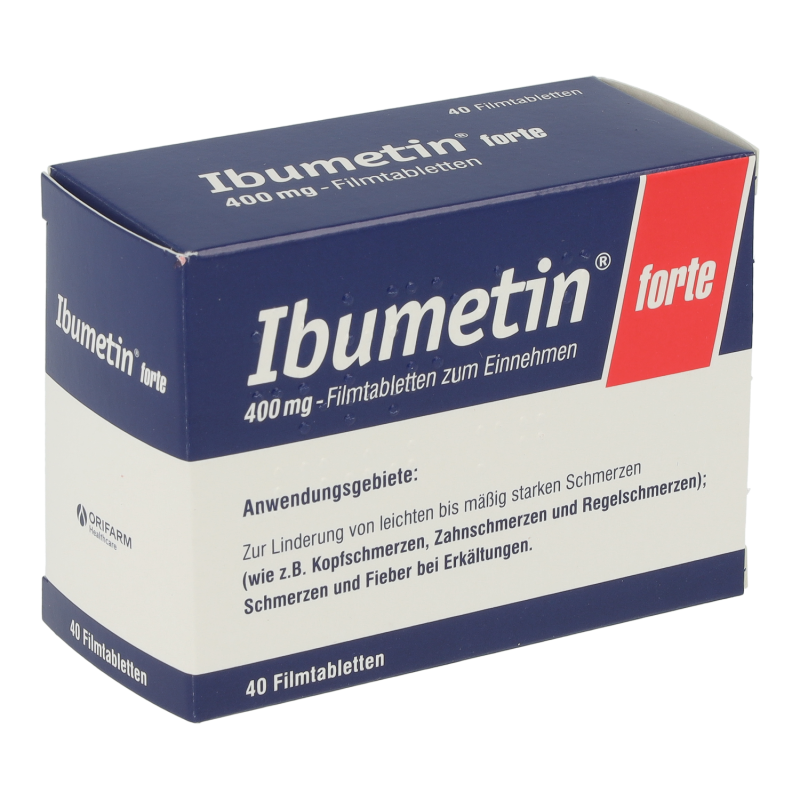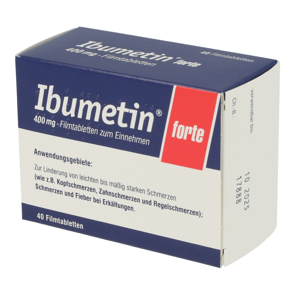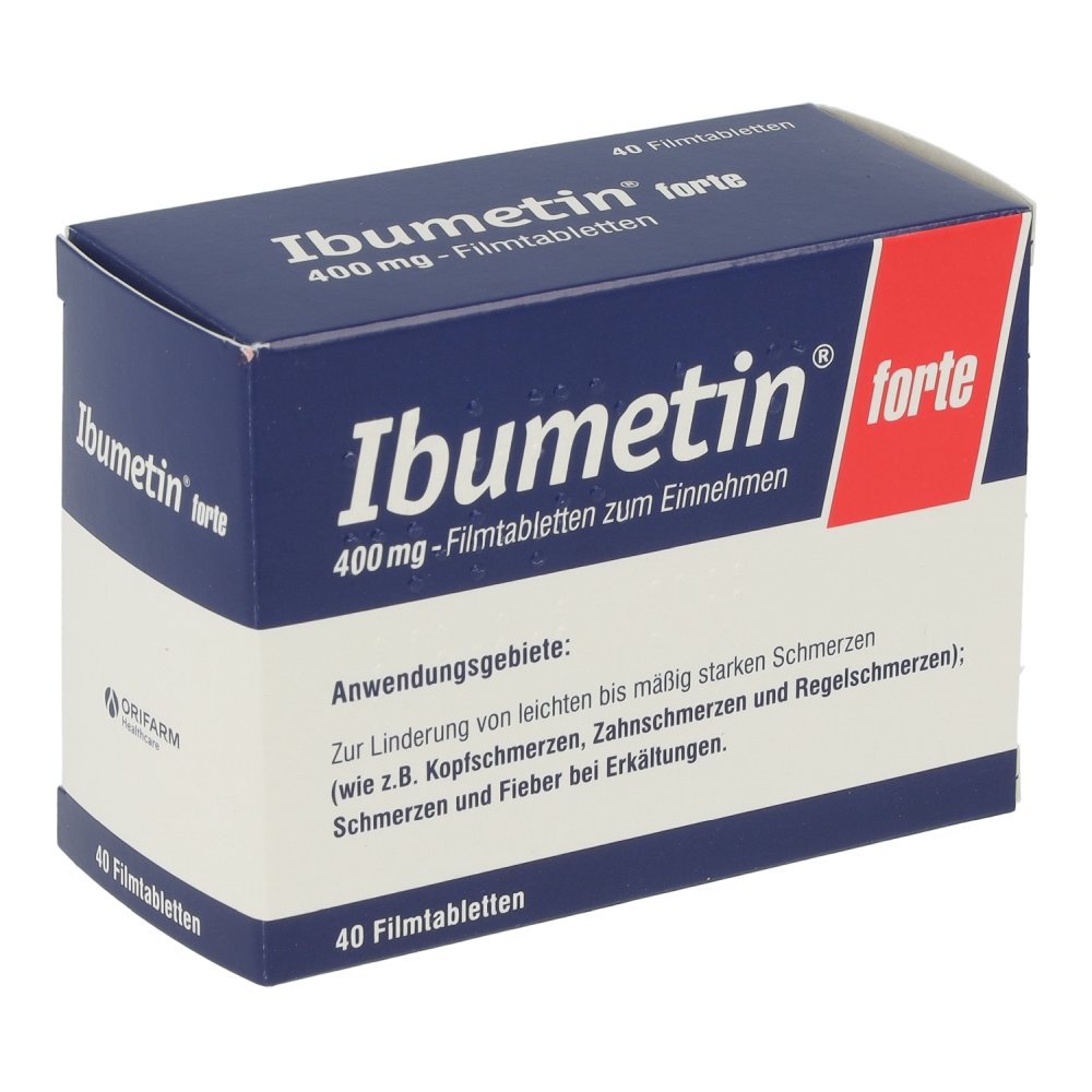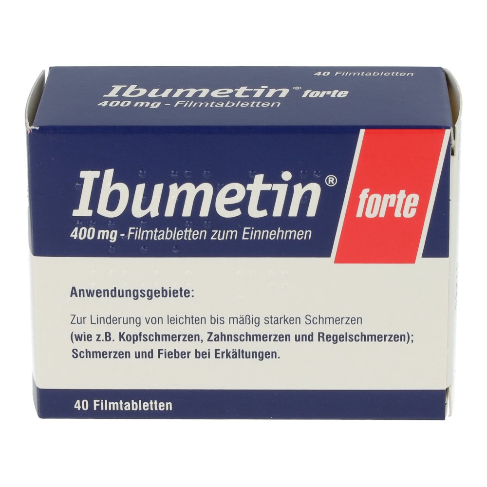 Eine Ibumetin forte 400 mg – Filmtablette enthält als Wirkstoff 400 mg Ibuprofen und wird angewendet zur Linderung von leichten bis mäßig starken Schmerzen (wie z.B. Kopfschmerzen, Zahnschmerzen und Regelschmerzen) sowie zur Linderung von Schmerzen und Fieber bei Erkältungen.