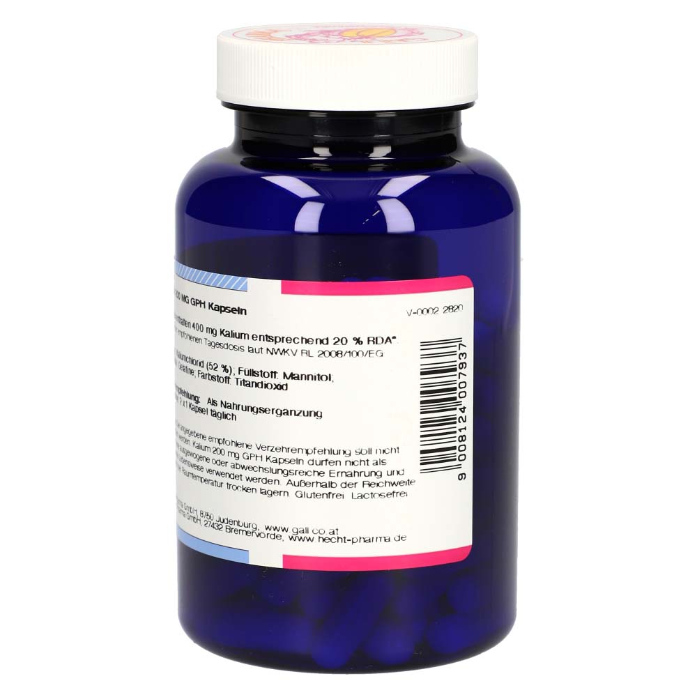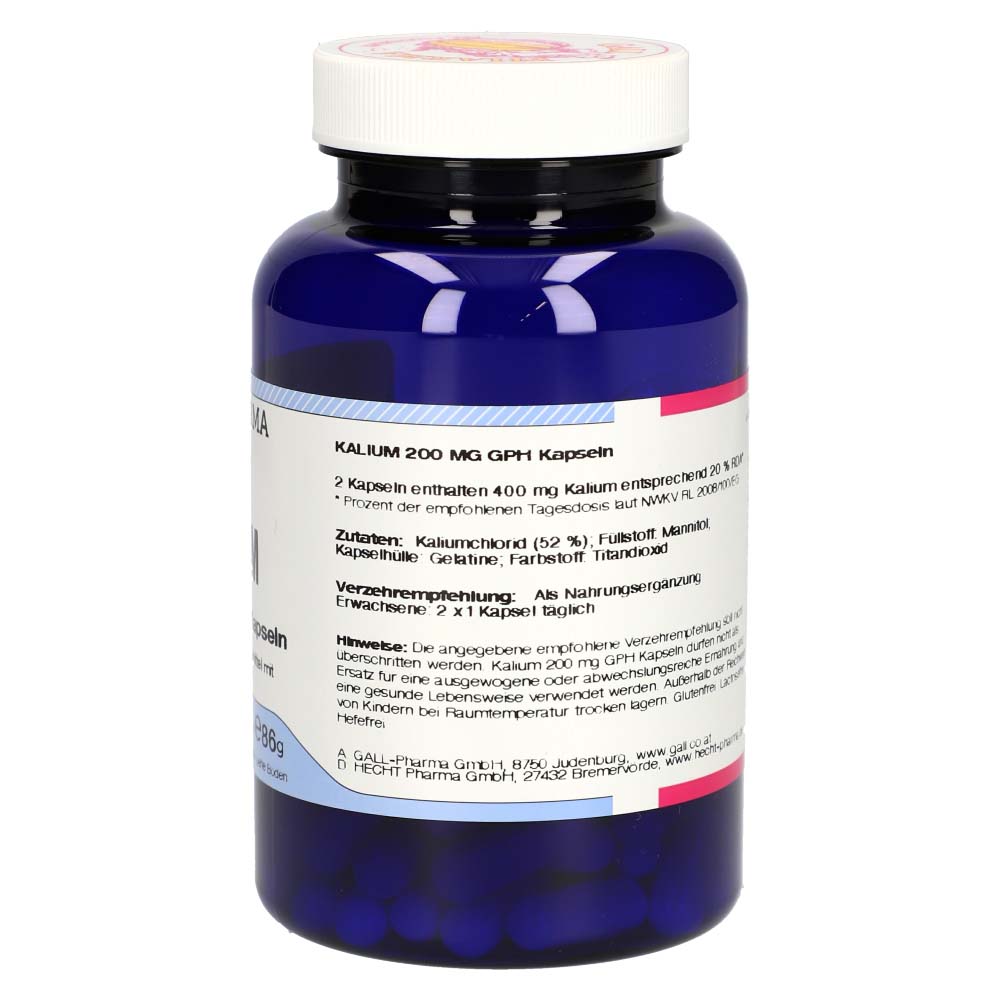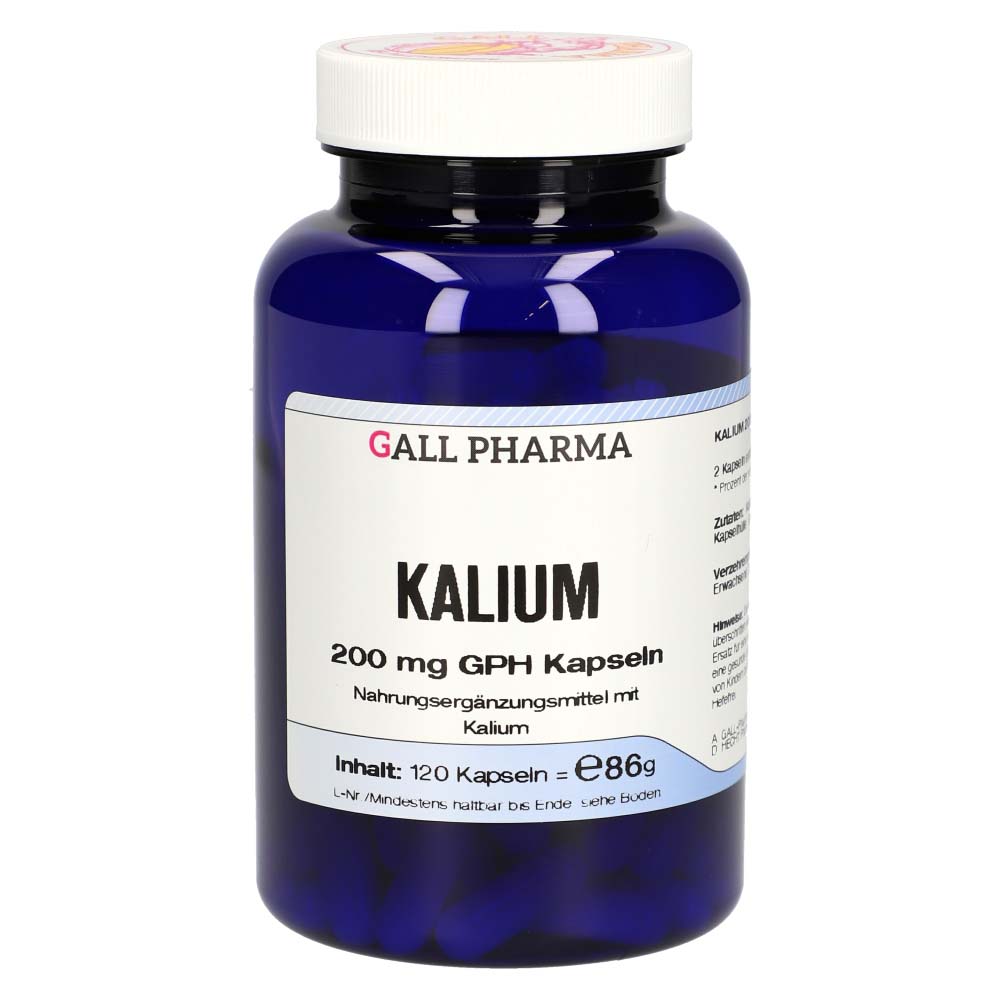 Kalium 200 mg GPH Kapseln enthalten Kalium in Form von Kaliumchlorid, das laut Healthclaims VO zu einer normalen Funktion des Nervensystems, zu einer normalen Muskelfunktion und zur Aufrechterhaltung eines normalen Blutdrucks beiträgt. Ein Mangel an Kalium kann eine Reihe von Störungen im Körper bewirken, die relativ unspezifisch sind. Dieses Produkt erhalten Sie in den Packungsgrößen 120 und 180 Stück.