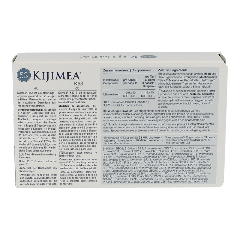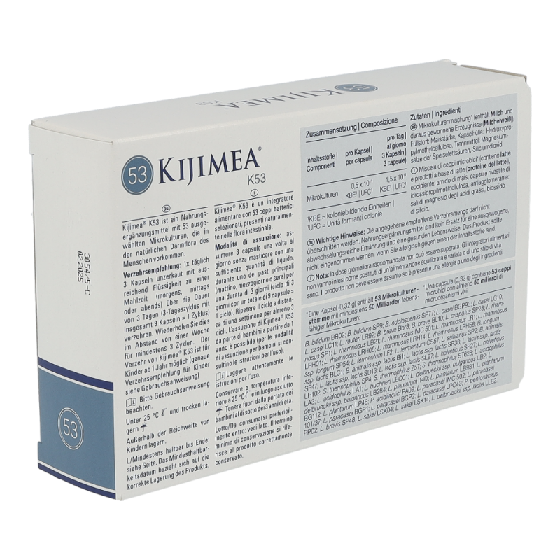 Kijimea K53 Kapseln ist ein diätetisches Lebensmittel für besondere medizinische Zwecke (ergänzende bilanzierte Diät) zum Diätmanagement bei allergischer Rhinokonjunktivitis, z. B. Heuschnupfen, mit den typischenSymptomen laufende/juckende/verstopfte Nase, Niesen, juckende/tränende Augen.