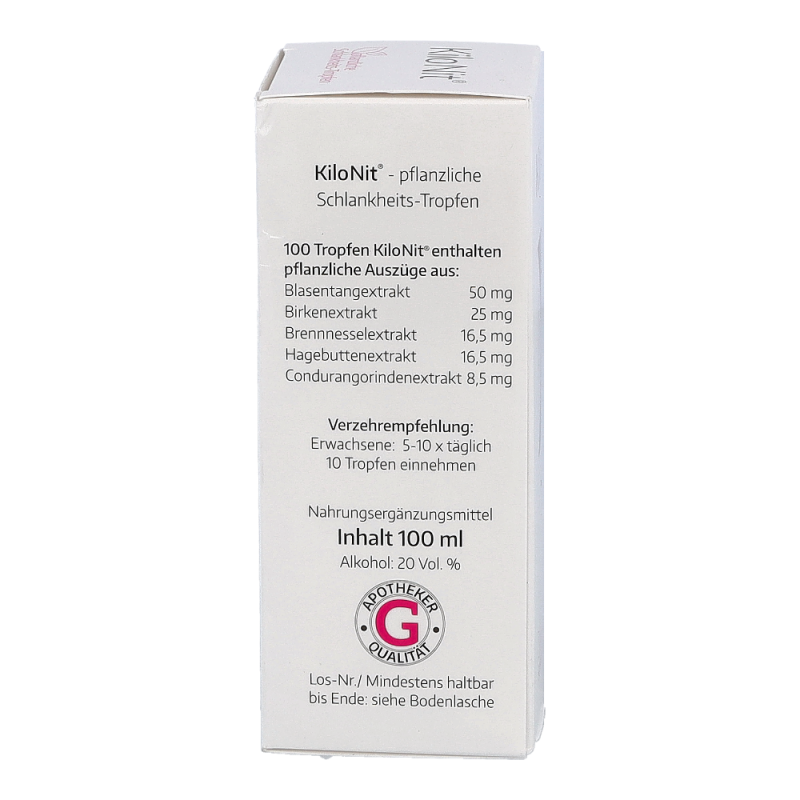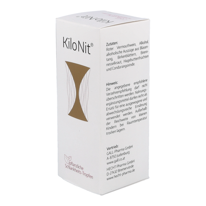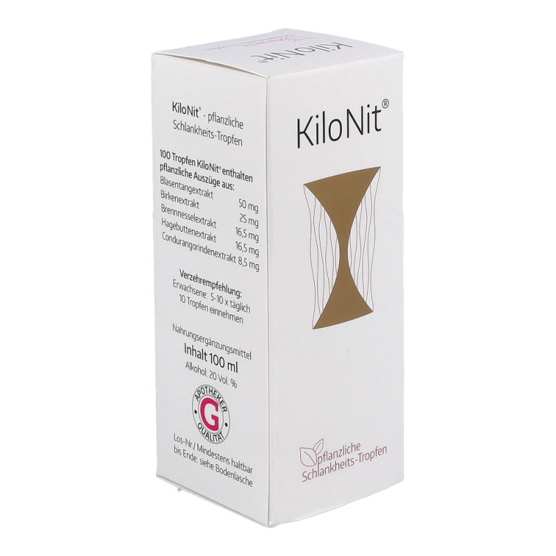 Kilo-nit Tropfen sind ein rein pflanzliches Verzehrprodukt zur Unterstützung der Gewichtsabnahme ohne komplizierte Diätpläne, ohne quälendes Hungergefühl und ohne herabgesetztes Wohlbefinden. Kilo Nit enthält Pflanzenauszüge aus Blasentang, Birkenblättern und Brennnesseln.
