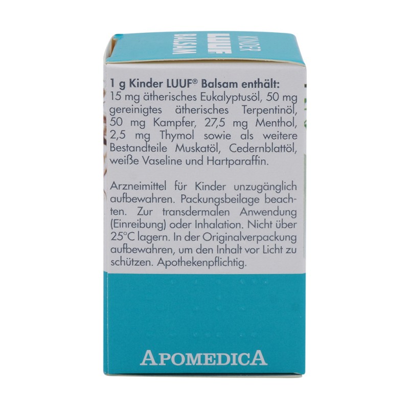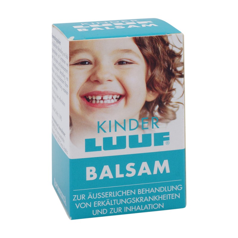 Kinder LUUF Balsam ist ideal für Kinder ab dem vollendeten 2 Lebensjahr. Bewährte naturreine ätherische Öle wie Eukalyptusöl plus Kampfer und Menthol sind genau auf das Kindesalter abgestimmt. Kinder LUUF Balsam wirkt krampflösend und keimhemmend. Der festsitzende Schleim wird verflüssigt und kann besser abgehustet werden. Insgesamt wird die Atmung erleichtert und der Hustenreiz gelindert.