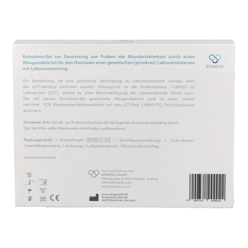 Personen mit primärer Laktoseintoleranz sind von einem genetisch bedingten Mangel des Verdauungsenzyms Laktase, das für den Milchzuckerabbau verantwortlich ist, betroffen. Mittels Wangenabstrich, der von den Innenseiten beider Wangen entnommen wird, kann festgestellt werden, ob eine genetische Veranlagung zur Laktoseintoleranz vorliegt.