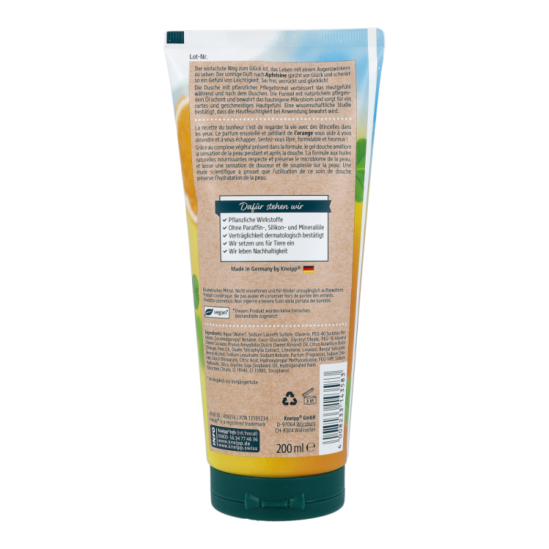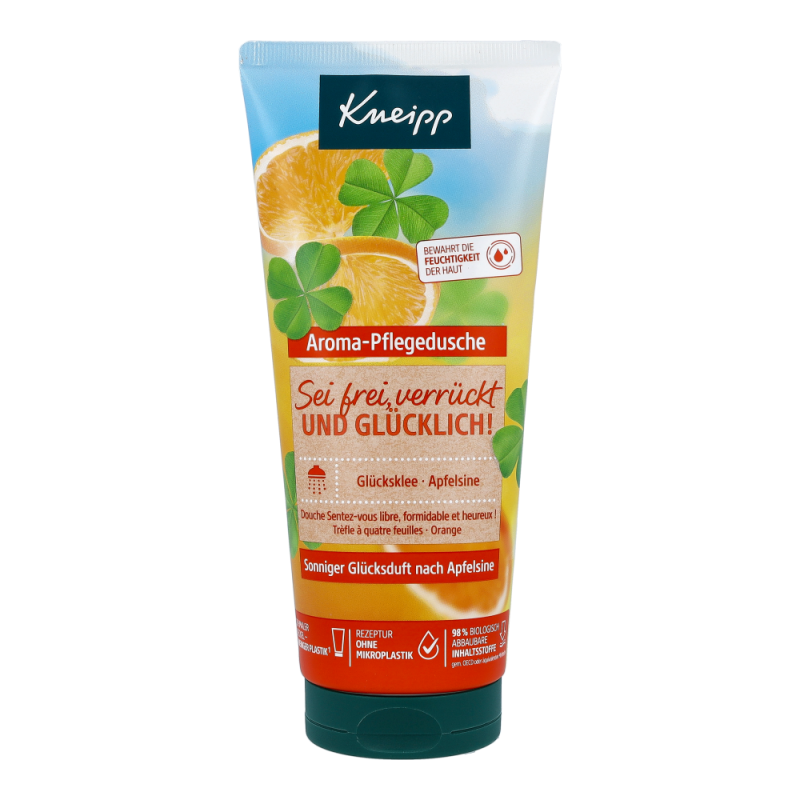 Kneipp Aroma Pflegedusche Sei frei, verrückt und glücklich! 200 ml mit dem sonnigen Duft nach Apfelsine sprüht vor Glück und schenkt so ein Gefühl der Leichtigkeit. Die pflanzliche Pflegeformel verbessert das Hautgefühl während und nach dem Duschen