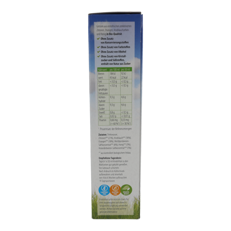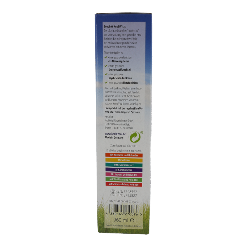 Knobivital enthält von Natur aus lebensnotwendiges Thiamin. Thiamin trägt bei zu: einer normalen Herzfunktion, einer normalen Funktion des Nervensystems, einem normalen Energiestoffwechsel und einer normalen psychischen Funktion.