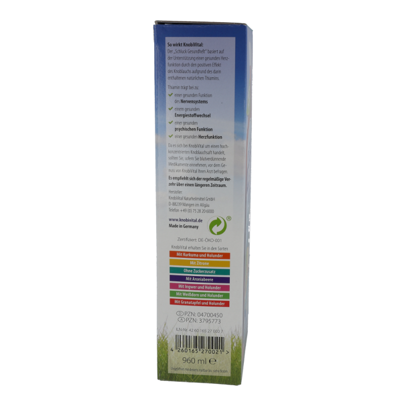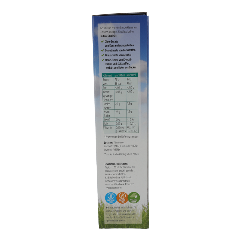Knobivital enthält von Natur aus lebensnotwendiges Thiamin. Thiamin trägt bei zu: einer normalen Herzfunktion, einer normalen Funktion des Nervensystems, einem normalen Energiestoffwechsel und einer normalen psychischen Funktion.