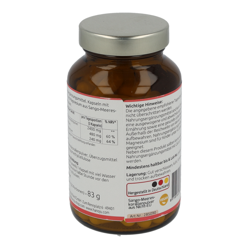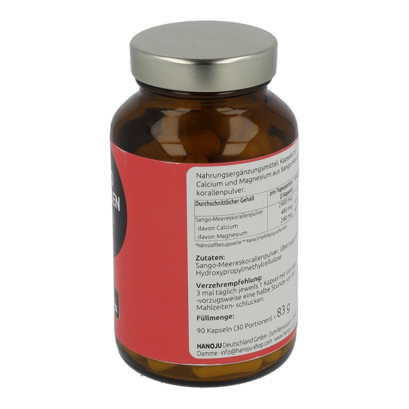 Drei Kapseln enthalten (empfohlene tägliche Verzehrmenge): 2400 mg Korallenkalzium Pulver, 300 mg Hydroxypropylmethylcellulose (Kapselhülle).
