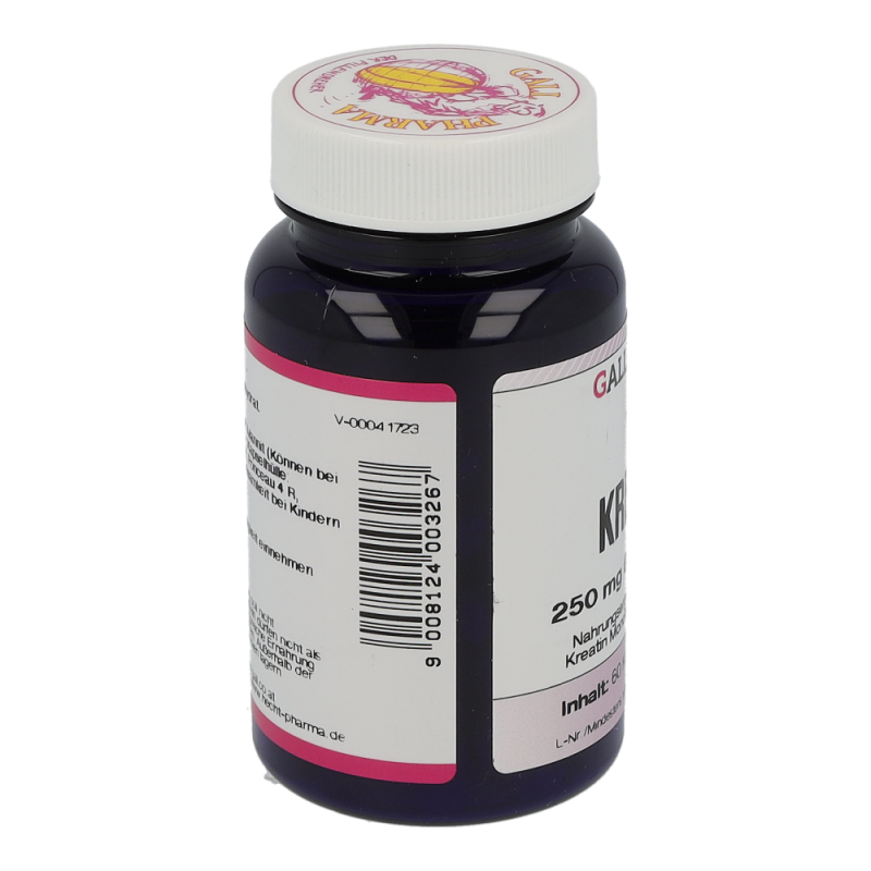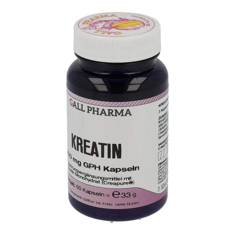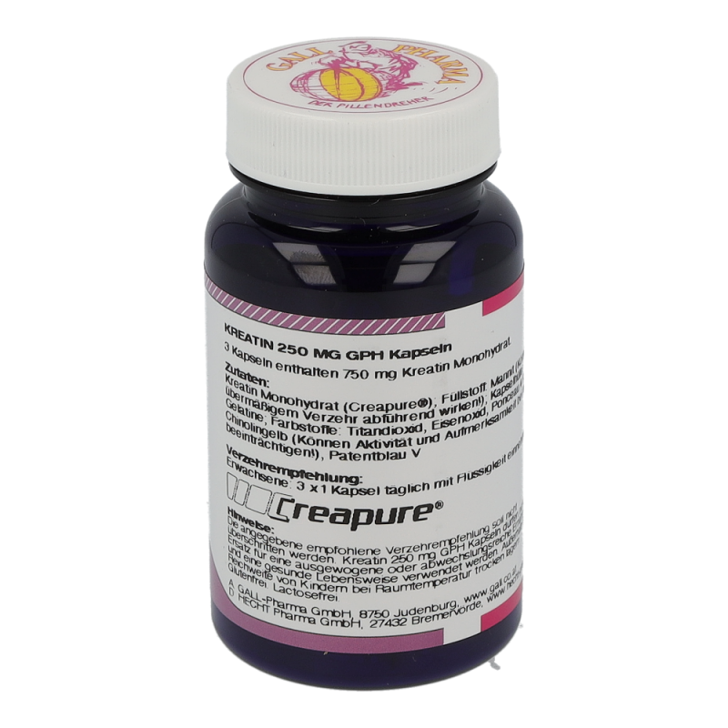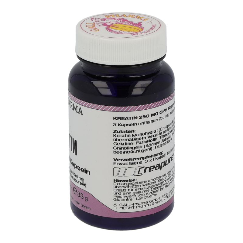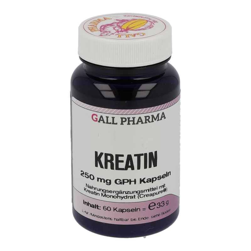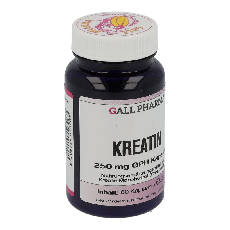 Gall Pharma Kreatin 250 mg Kapseln enthalten Kreatin-Monohydrat in einer Hartgelatinekapsel. Der Körper verbraucht am Tag durchschnittlich etwa 2 g Kreatin. Diese Menge wird zur Hälfte über die körpereigene Produktion mit Hilfe der Aminosäuren L-Arginin, Glycin und L-Methionin, zur anderen Hälfte über die Nahrungsaufnahme wieder ersetzt.