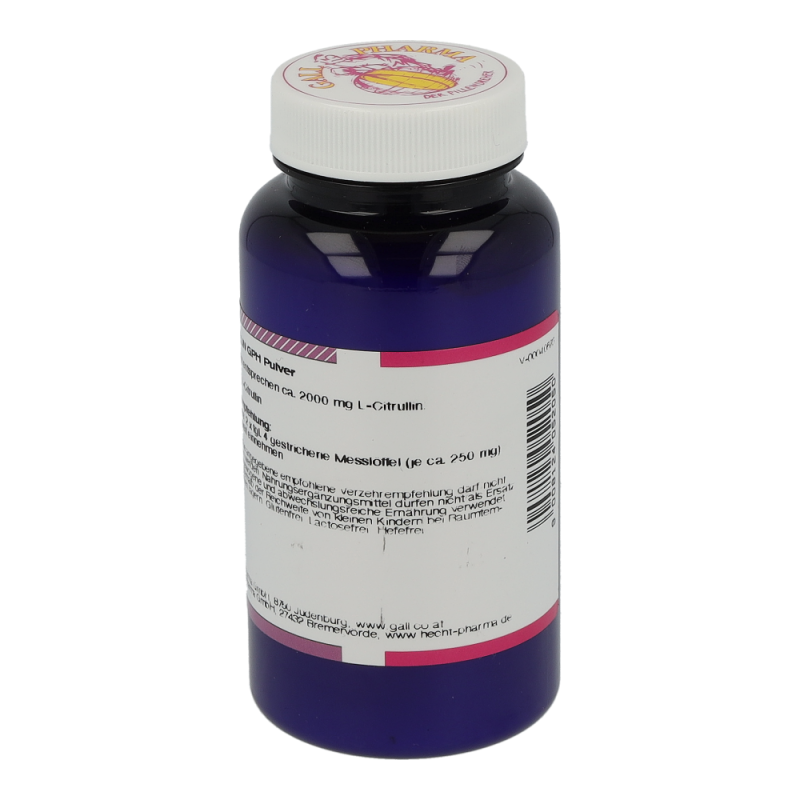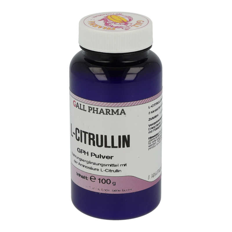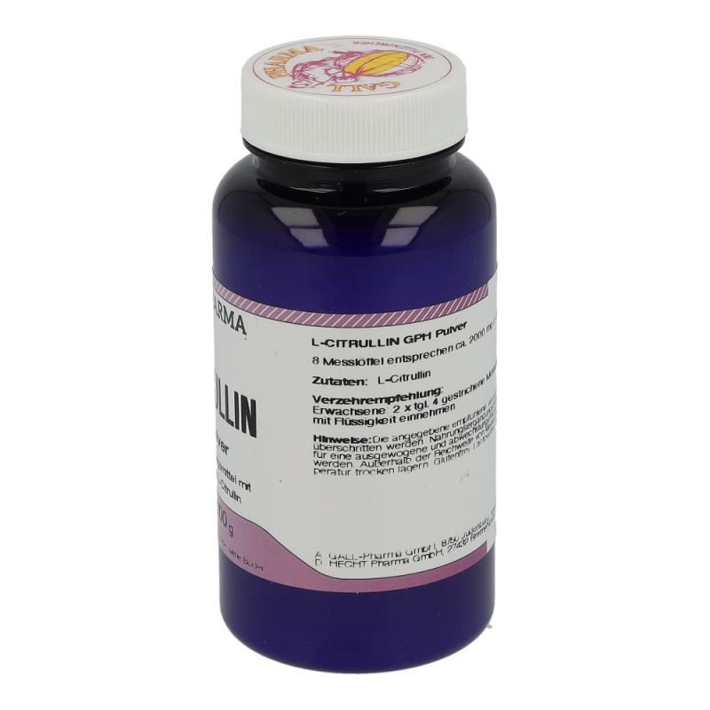 L-Citrullin GPH Pulver enthält 100 g L-Citrullin. Diese Aminosäure ist wichtig für den Stoffwechsel der Muskeln und hilft bei körperlicher Kraftlosigkeit und allgemeinen Erschöpfungszuständen. L-Citrullin unterstützt den Körper bei der Entgiftung von Ammoniak und leistet demnach einen wesentlichen Beitrag zur Aufrechterhaltung der physiologischen Leberfunktion