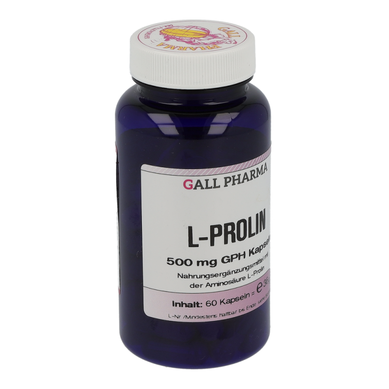 Gall Pharma L-Prolin 500 mg Kapseln enthalten 500 mg L-Prolin in einer Hartgelatinekapsel. Bedeutung hat diese Aminosäure vor allem für den Stoffwechsel des Kollagens