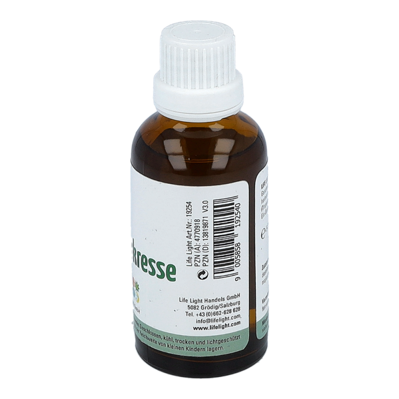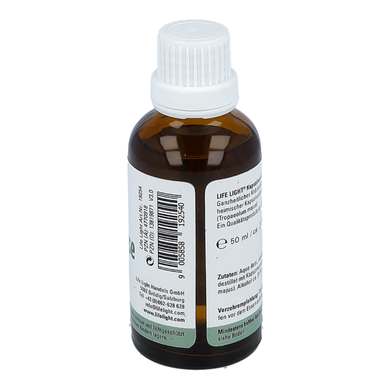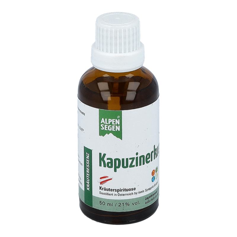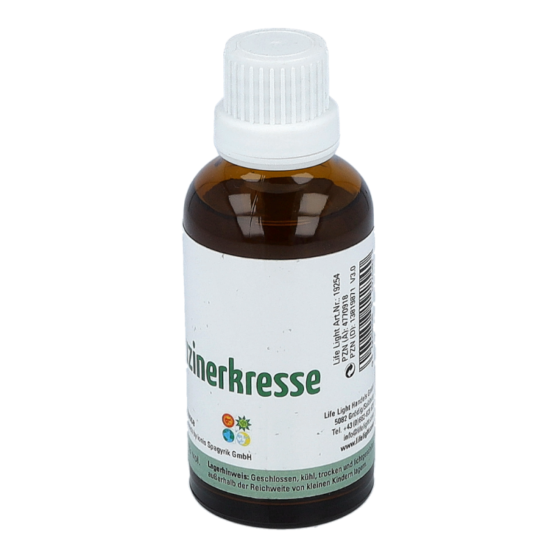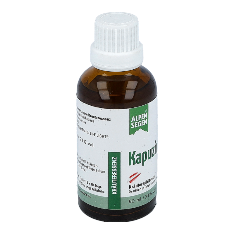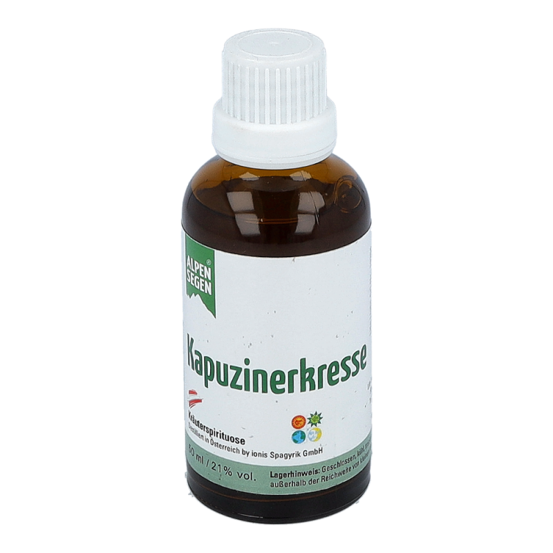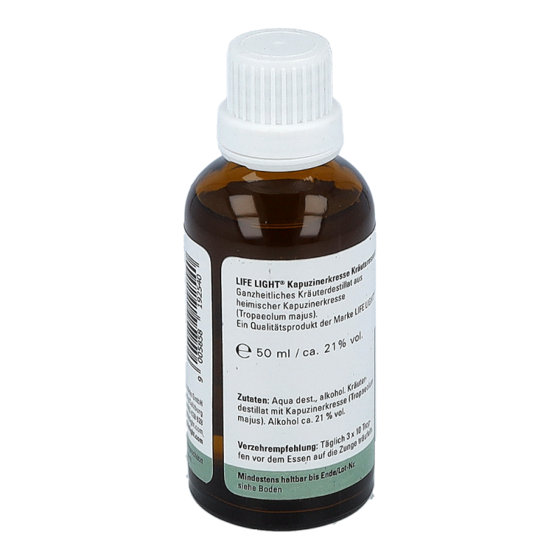 Das Nahrungsergänzungsmittel ist ein Kräuterdestillat aus heimischer Kapuzinerkresse, auch Tropaeolum majus genannt, und hat einen Alkoholgehalt von 21%. Nahrungsergänzungsmittel dienen nicht als Ersatz für eine abwechslungsreiche und ausgewogene Ernährung. Sie sind für Kinder unerreichbar aufzubewahren und die empfohlene Tagesdosis darf nicht überschritten werden.