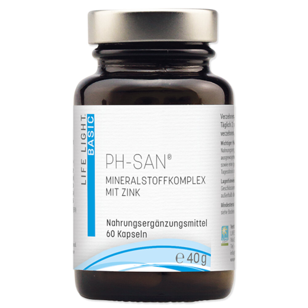 Die Life Light pHsan Mineralkomplex Kapseln enthalten eine spezielle Mineralstoffmischung zur orthomolekularen Anwendung, um den Bedarf an diesen Stoffen, bedingt durch psychische und/oder physische Stressfaktoren sowie durch Umwelteinflüsse, zu decken. Sie sind reich an wertvollem Zink für eine normale DNA-Synthese und zur Erhaltung normaler Haut, Haare, Nägel und Knochen, Mangan für die Bindegewebsbildung und einen normalen Energiestoffwechsel, Selen zur Unterstützung der Schilddrüsenfunktion, Calcium für eine normale Blutgerinnung und Magnesium für eine gesunde Muskelfunktion und einem normalen Elektrolytgleichgewicht. Nahrungsergänzungsmittel dienen nicht als Ersatz für eine abwechslungsreiche und ausgewogene Ernährung. Sie sind für Kinder unerreichbar aufzubewahren und die empfohlene Tagesdosis darf nicht überschritten werden – wir führen alle Produkte von Apozen zu Sonderpreisen!