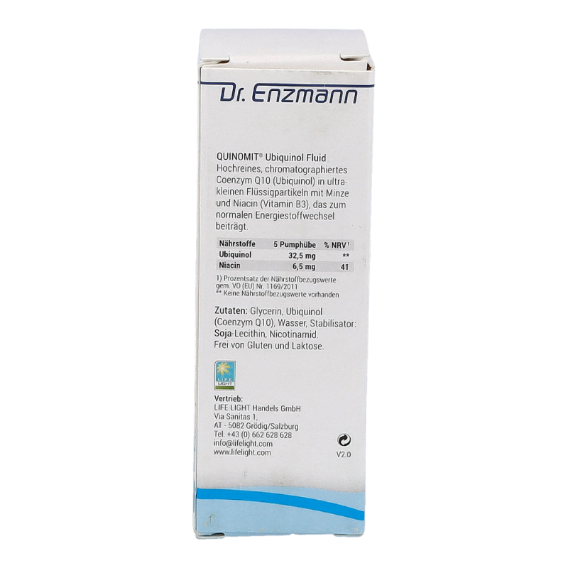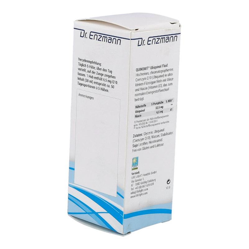 Life Light Quinomit Fluid trägt zu einer normalen Funktion des Nervensystems, zu einer normalen psychischen Funktion, zur Erhaltung normaler Haut und Schleimhäute und zu einer Verringerung von Müdigkeit und Ermüdung bei. Darüber hinaus unterstützt das Produkt den Energiestoffwechsel.