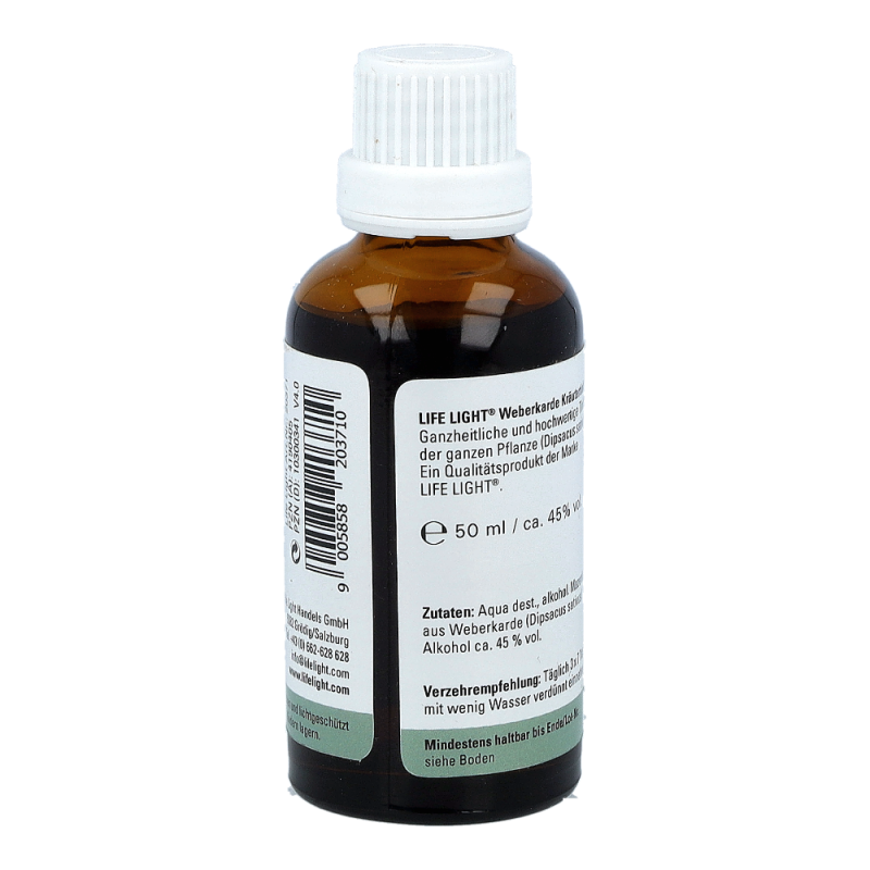 Life Light Weber-Karde Kräuterdestilat ist ein hochwertiges Kräuterdestillat aus wild gewachsenen Wurzeln der Weber-Karde, welche sich durch die besondere Qualität der Wild-Pflanzen und der händischen Verarbeitung auszeichnet. Die wertvollen Pflanzenstoffe der Weber-Karde entfalten eine besondere synergistische Wirkung auf körperlicher, geistiger und seelischer Ebene.