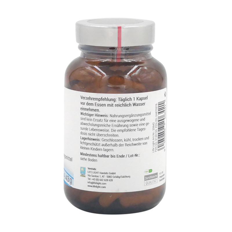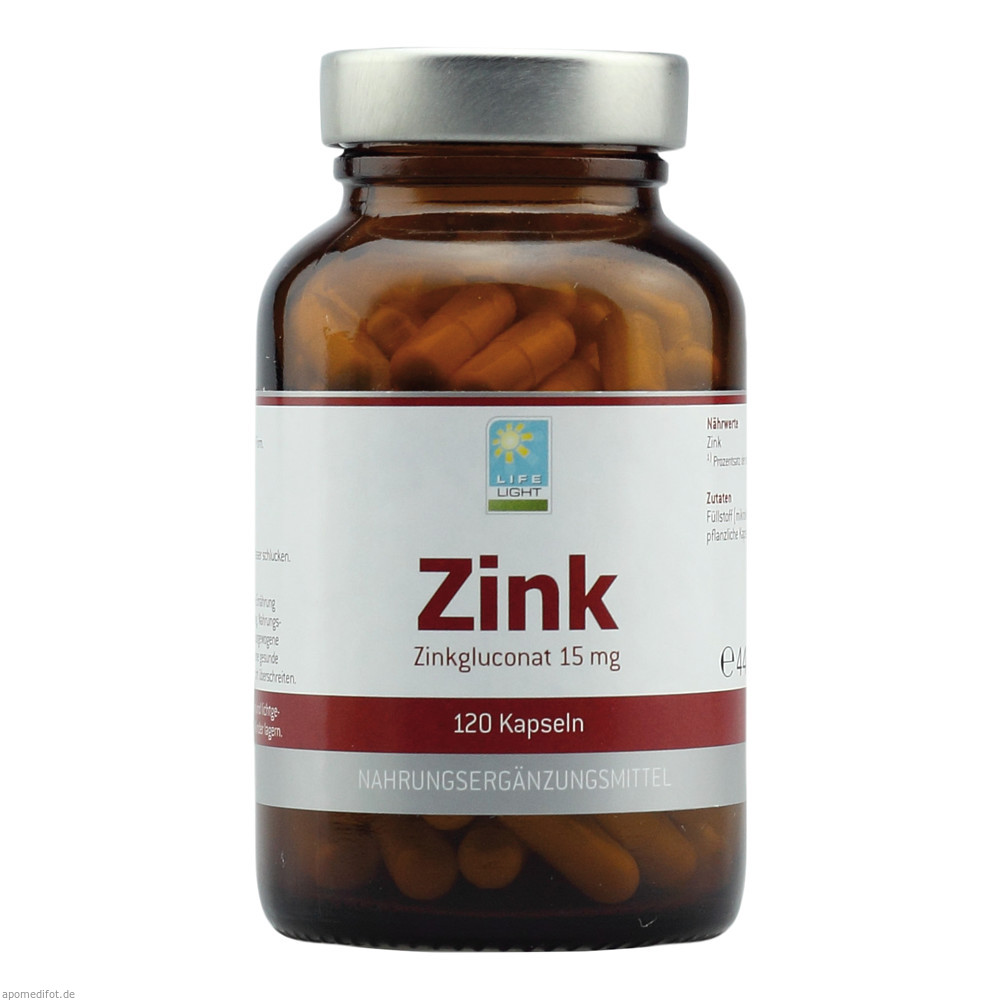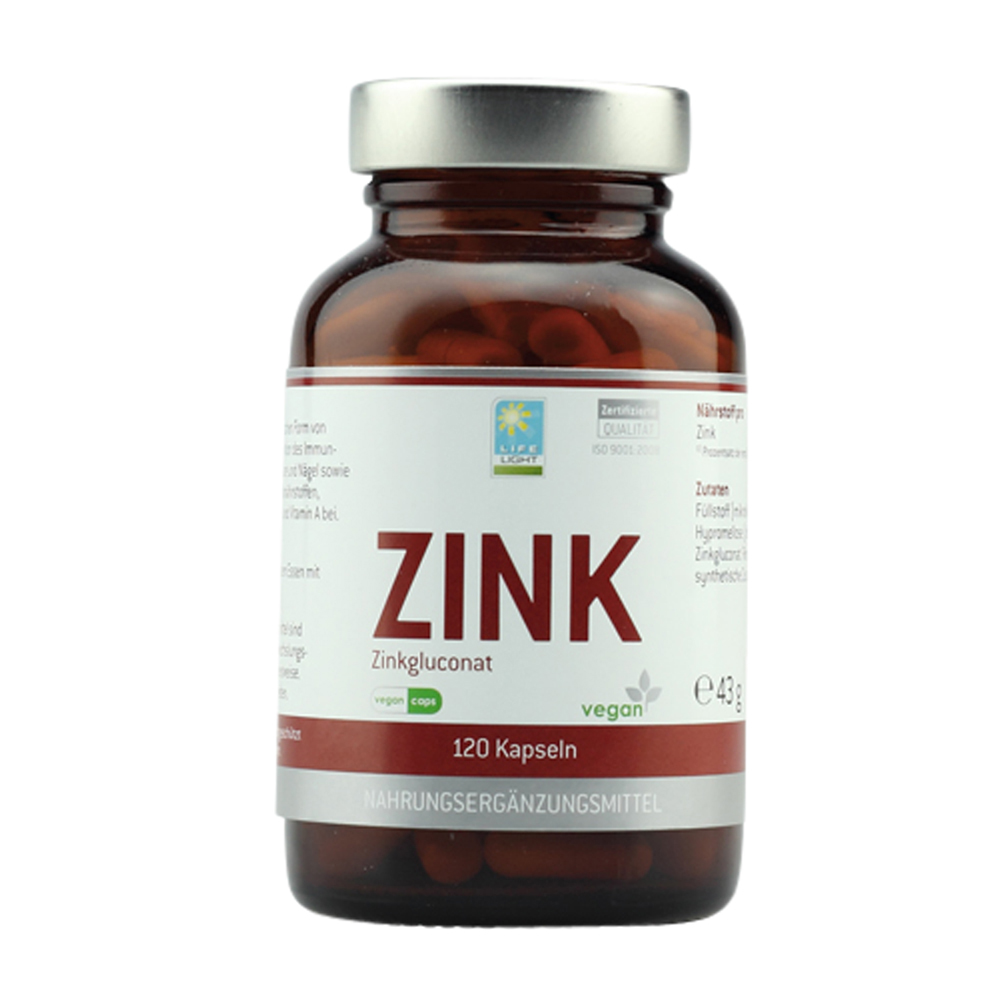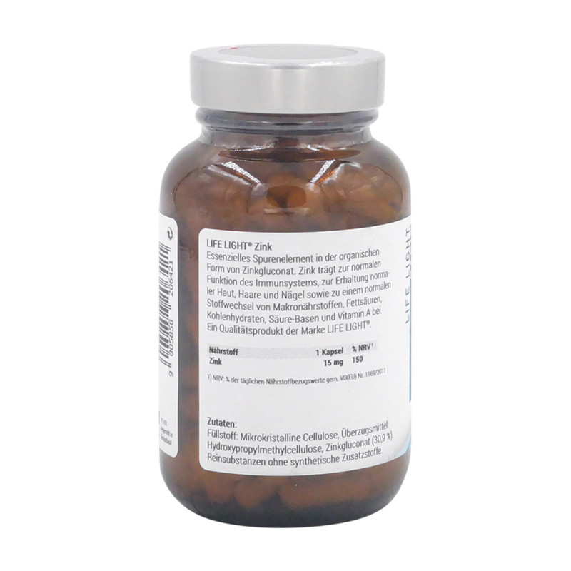 Life Light Zink Kapseln enthalten das essentielle Spurenelement Zink in organisch gebundener Form. Zink trägt zu einer normalen kognitiven Funktion, einer normalen DNA-Synthese sowie zur Erhaltung normaler Haut, Haare, Nägel und Knochen bei. Außerdem ist es wichtig für einen normalen Stoffwechsel des Vitamin A, der Fettsäuren sowie der Kohlenhydrate.