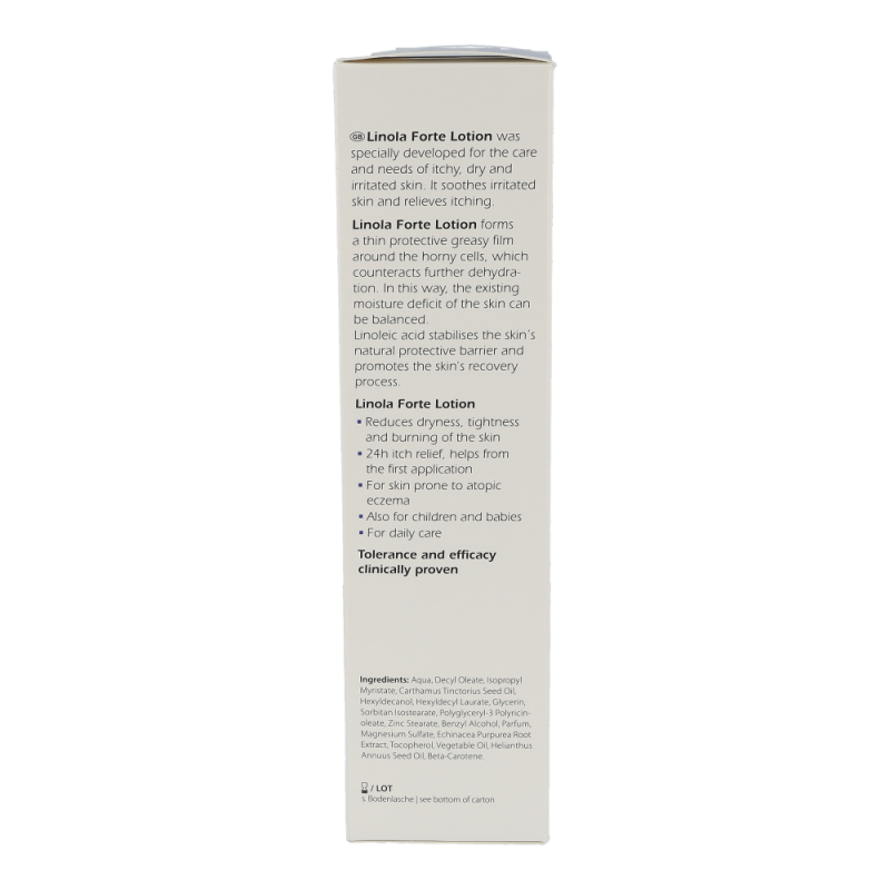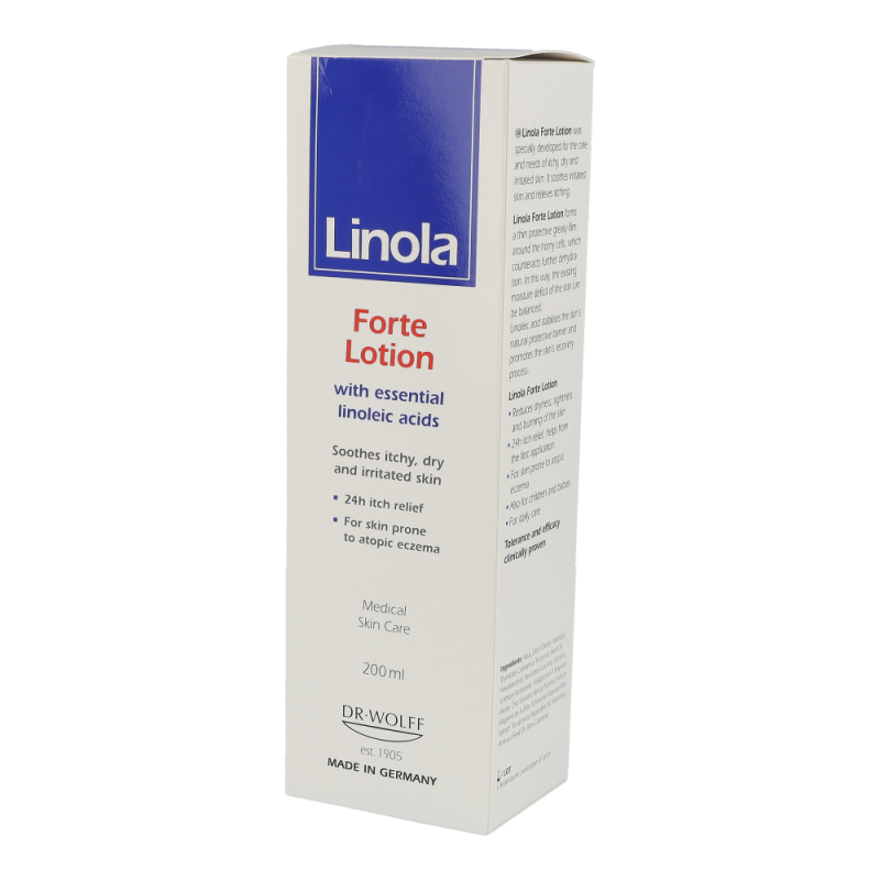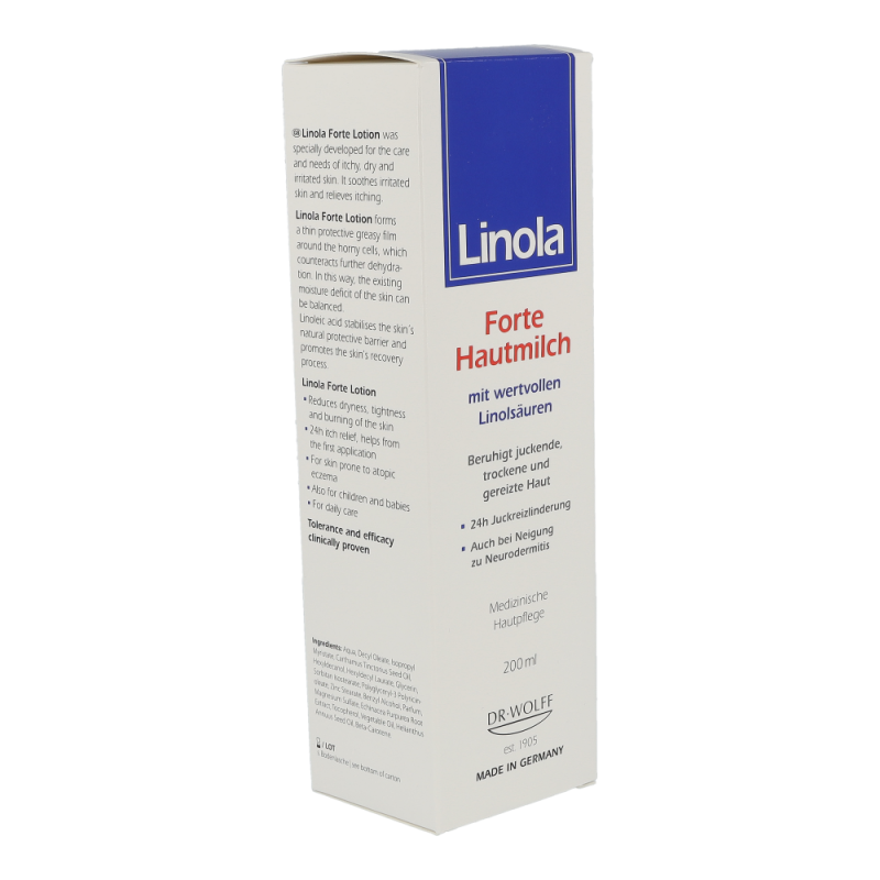 Linola Forte Hautmilch wurde speziell für die Pflegebedürfnisse juckender, trockener und gereizter Haut entwickelt. Sie beruhigt irritierte Haut und lindert den Juckreiz. Vorhandene Fett- und Feuchtigkeitsdefizite der Haut werden ausgeglichen. Die Linolsäure stabilisiert die natürliche Hautschutzbarriere und fördert den Erholungsprozess der Haut. Zudem reduziert sie Trockenheit, Spannungsgefühle und Brennen der Haut.