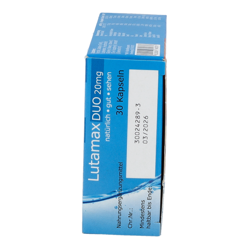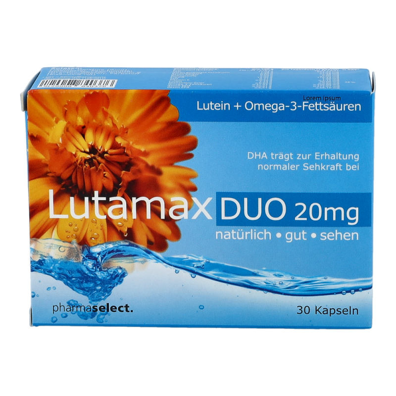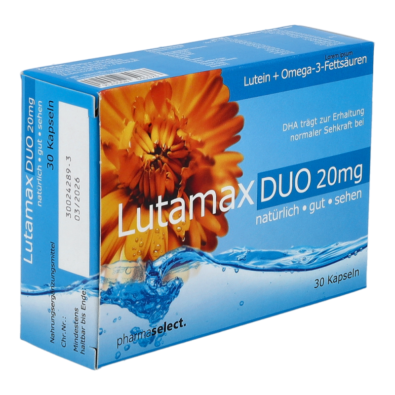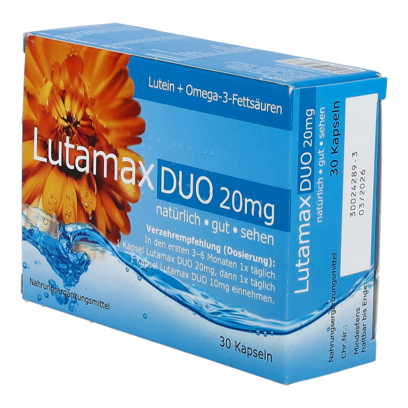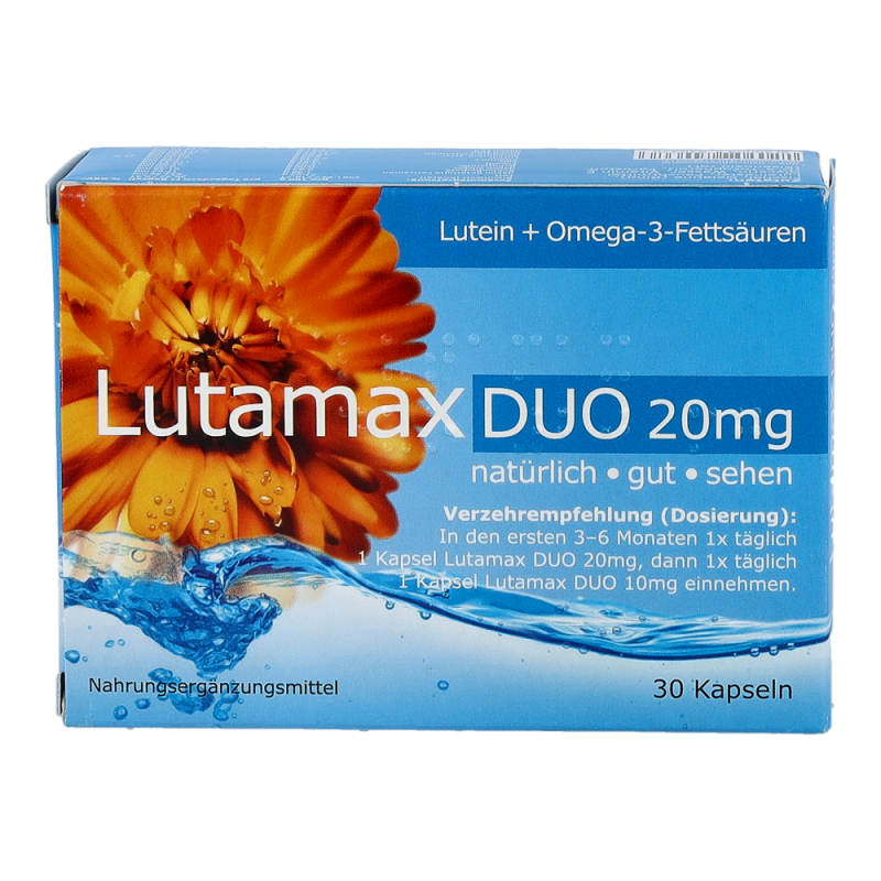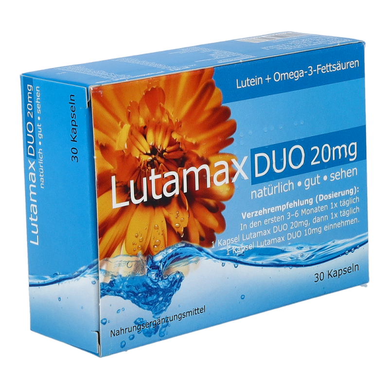 Lutamax-DUO-Kapseln wurden speziell als diätetisches Mittel zum Schutz der Netzhaut bei Altersbedingter Makuladegeneration (AMD) entwickelt. Die Einnahme wird in allen Phasen der AMD, auch in den Spätphasen, empfohlen. Das Produkt enthält die essentiellen Nährstoffe Lutein, Zeaxanthin und die Ome- ga-3-Fettsäuren DHA und EPA. Lutein und Zeaxanthin schützen die Sehzellen vor Lichtschäden und die Omega-3-Fettsäuren DHA und EPA sind für die richtige Funktion der Sehzellen (Fotorezeptoren) notwendig und erhöhen die Widerstandkraft des Auges gegen schädigende Einflüsse