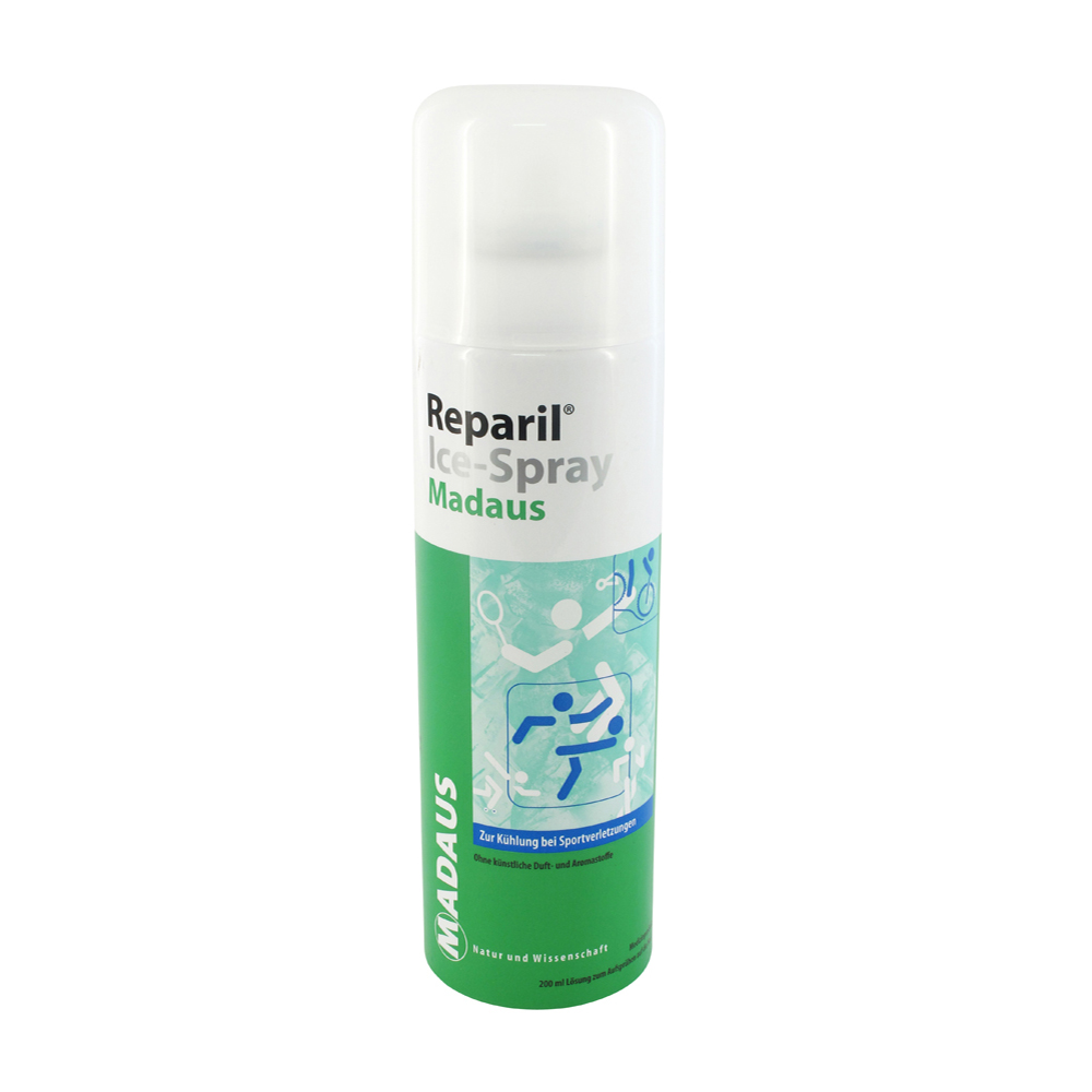 Ideal für Sportlerinnen und Sportler, Reparil Ice Spray von MADAUS ist ein kühlender Spray zur Anwendung bei z. B. schmerzhaften Stauchungen und Schwellungen