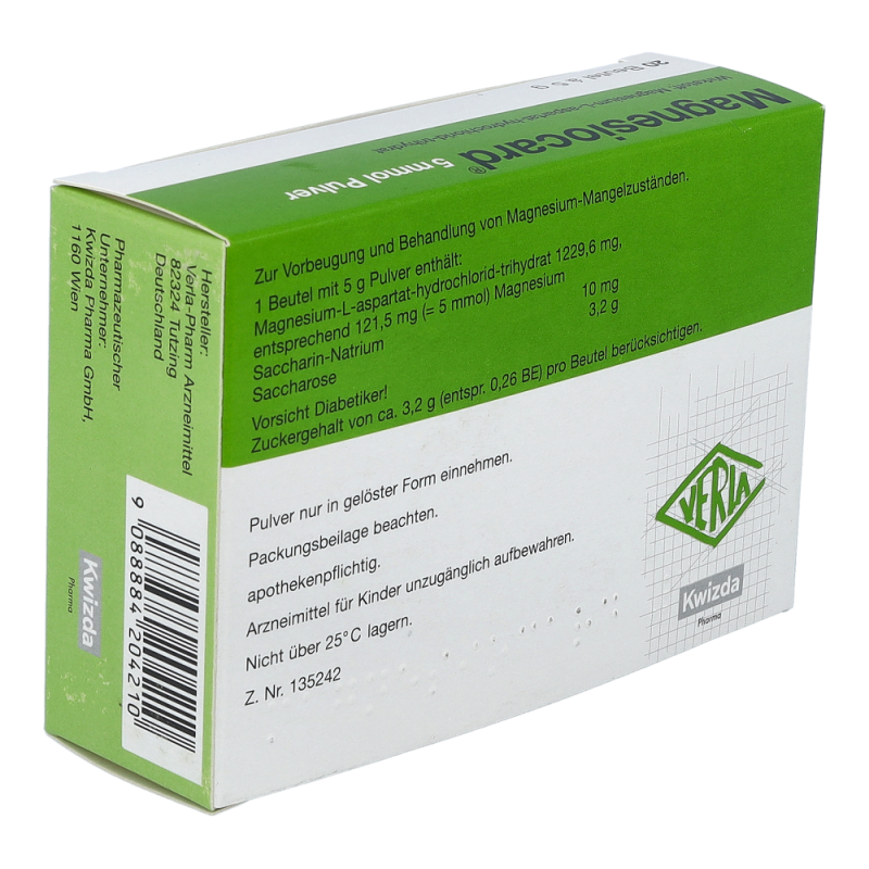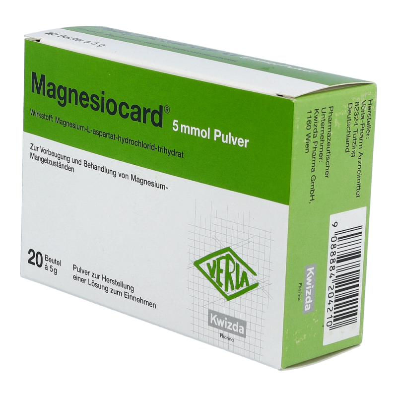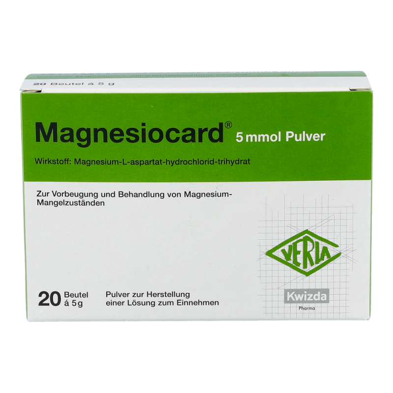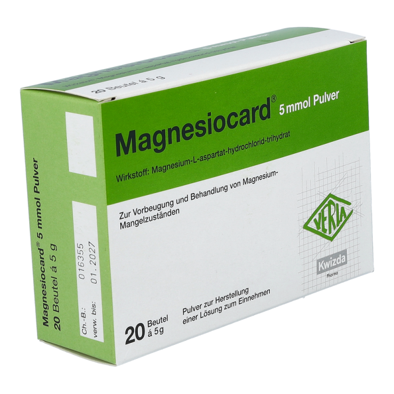 Magnesiocard Pulver 5 mmol 5 g ist ein Mineralstoffpräparat und enthält als Wirkstoff Magnesium-L-aspartat-hydrochlorid-trihydrat. Dieses hochwirksame wird zur Vorbeugung und Behandlung von Magnesium-Mangelzuständen eingenommen.