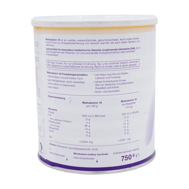 Es lässt sich leicht in Getränke oder Energie-Gele mischen, um für sportliche Belastungen wie z.B. einen Langstreckenlauf ausreichend Kohlenhydrate zu sich zu nehmen. Die Dosierung erfolgt individuell nach dem persönlichen Energiebedarf. 100g Maltodextrin 19 enthält durchschnittlich 380 kcal.